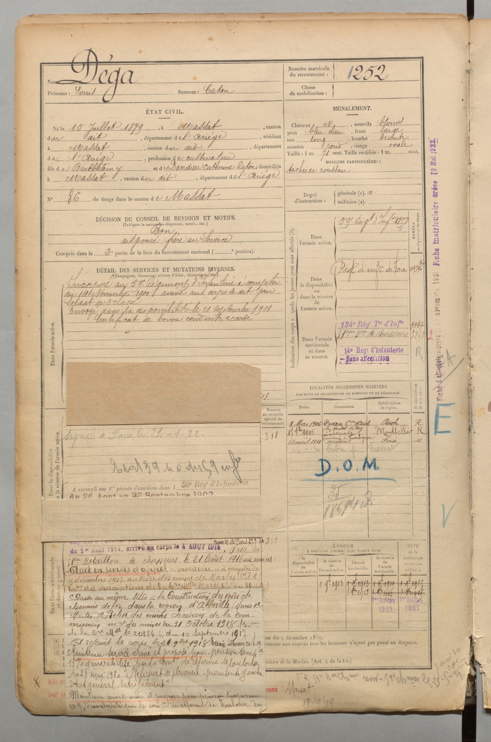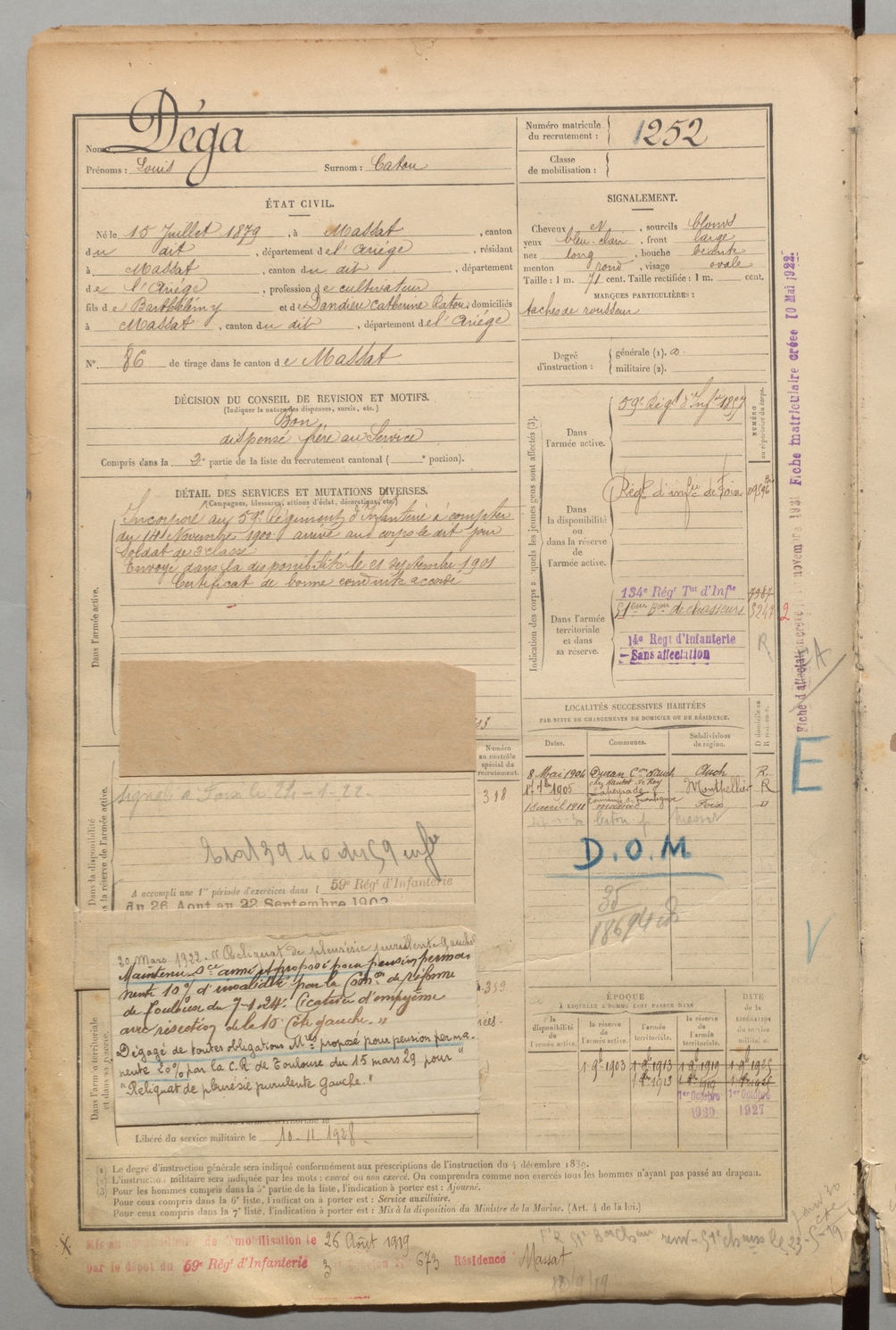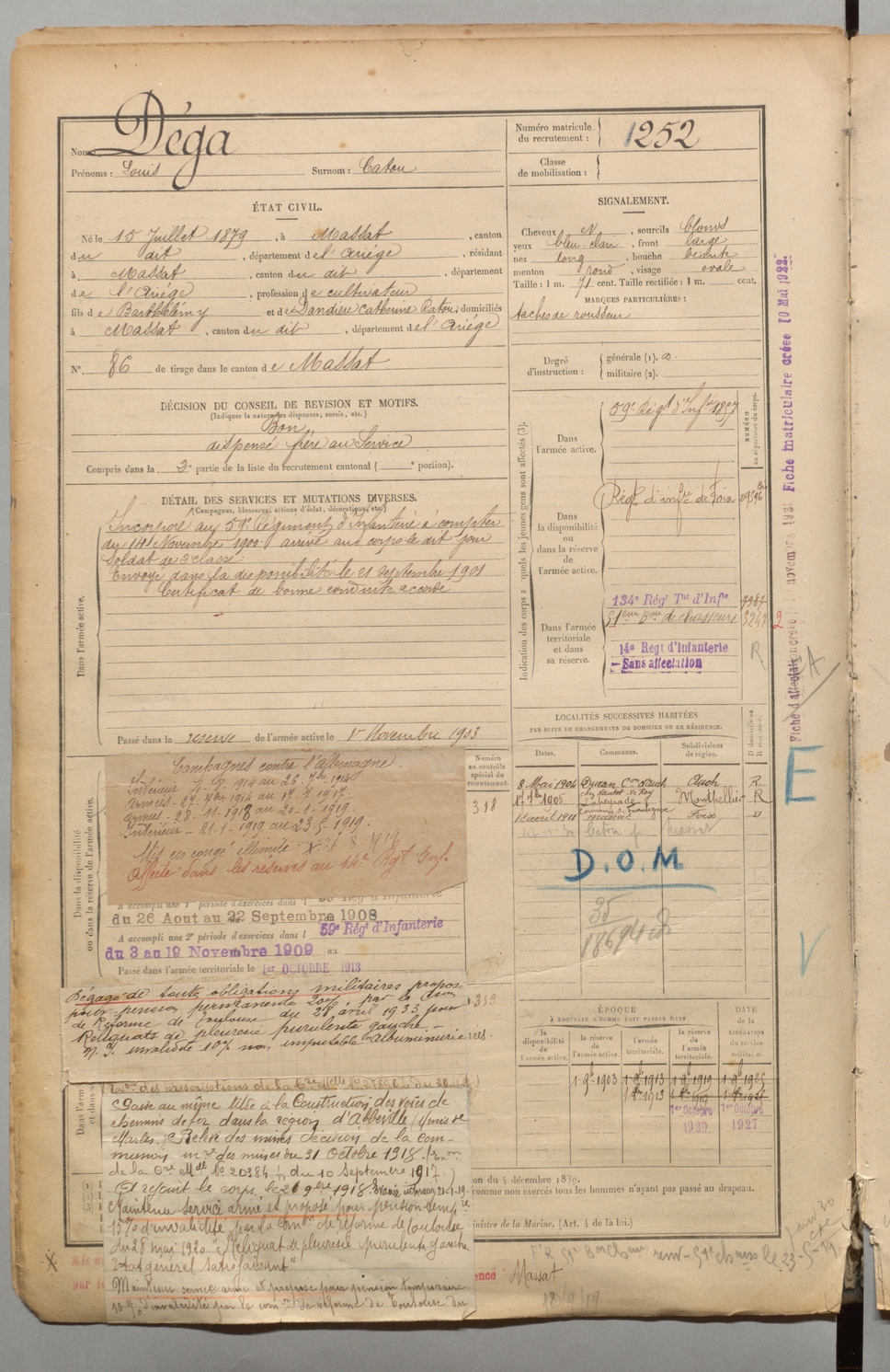 | Déga | Louis dit Catou | FOIX | 1 R 458 | 1899 | Massat | Massat | 1252 |