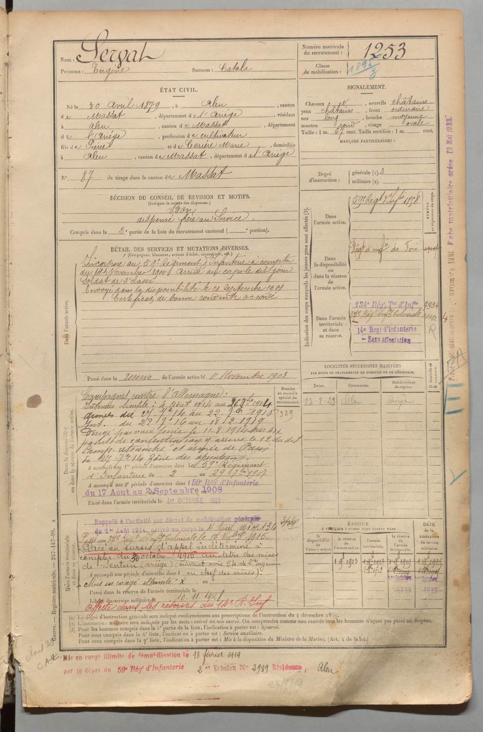 | Servat | Eugène dit Catala | FOIX | 1 R 458 | 1899 | Aleu | Aleu | 1253 |