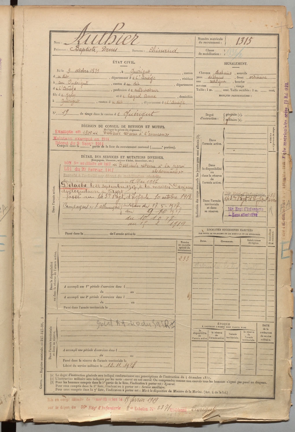 | Authier | Baptiste Denis dit Chinaud | FOIX | 1 R 458 | 1899 | Quérigut | Quérigut | 1315 |