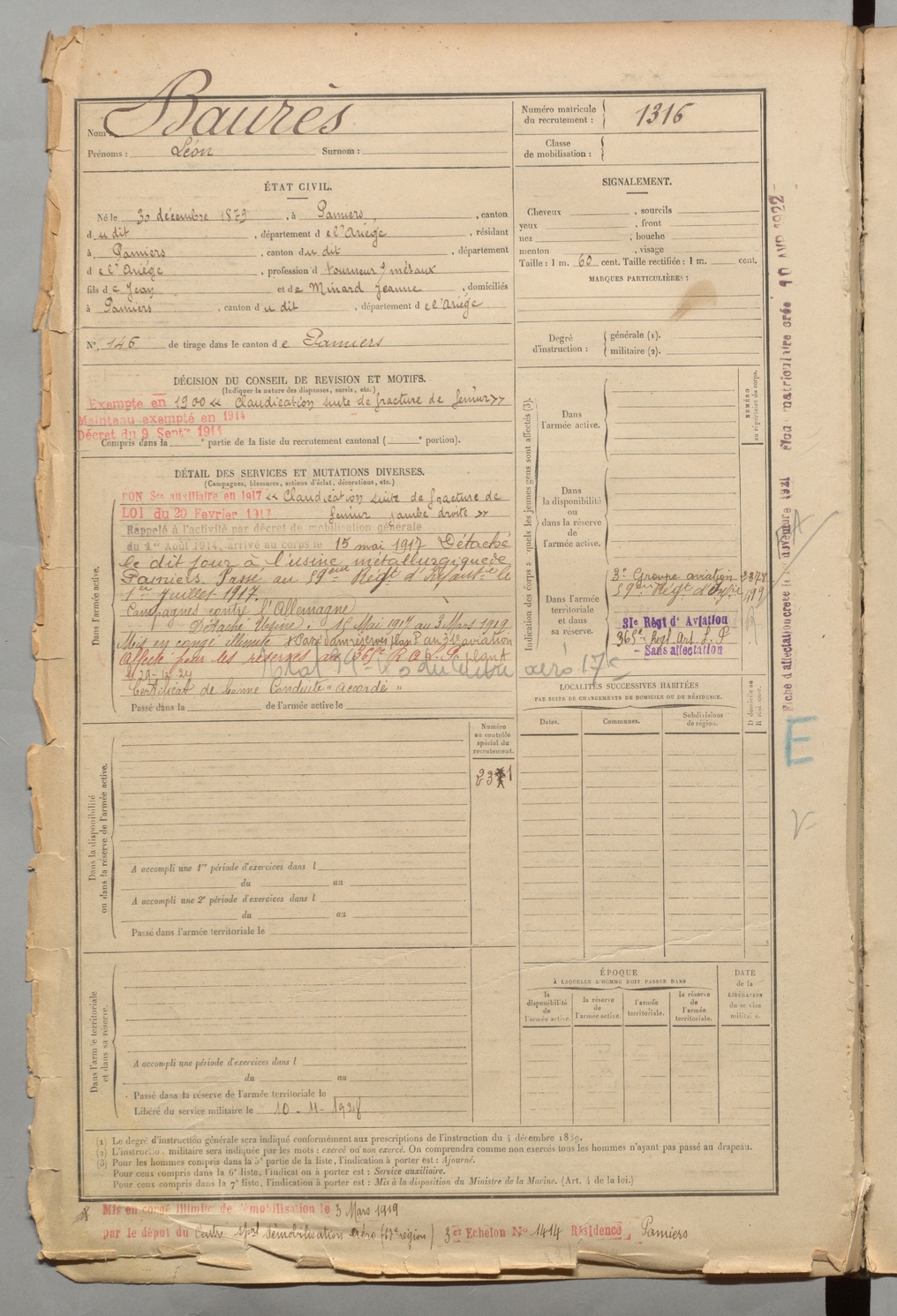 | Baurès | Léon | FOIX | 1 R 458 | 1899 | Pamiers | Pamiers | 1316 |