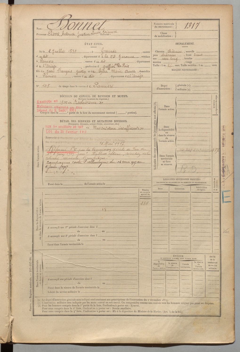 | Bonnet | Pierre Antoine Justin Louis Etienne | FOIX | 1 R 458 | 1899 | Grenade | Pamiers | 1317 |