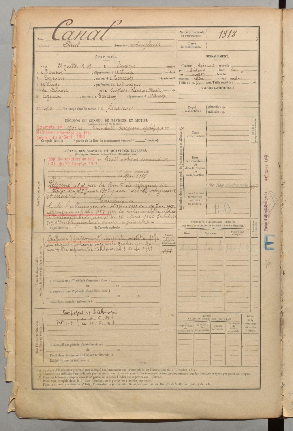 | Canal | Paul dit Anglade | FOIX | 1 R 458 | 1899 | Cazenave-Serres-et-Allens | Cazenave-Serres-et-Allens | 1318 |