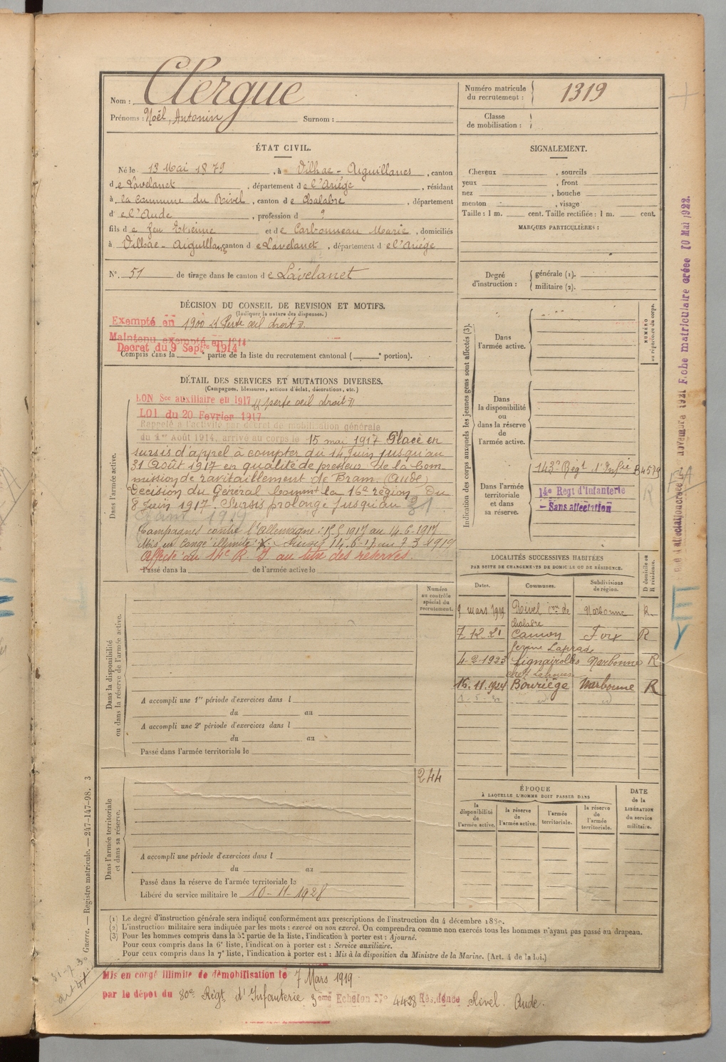| Clergue | Noël Antonin | FOIX | 1 R 458 | 1899 | Vilhac-Aigullanes | Commune de Rivel | 1319 |