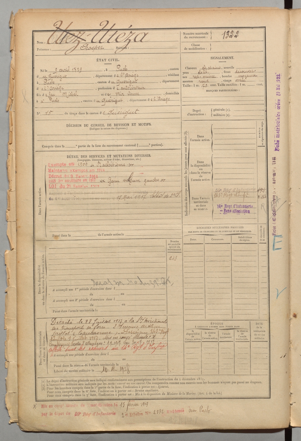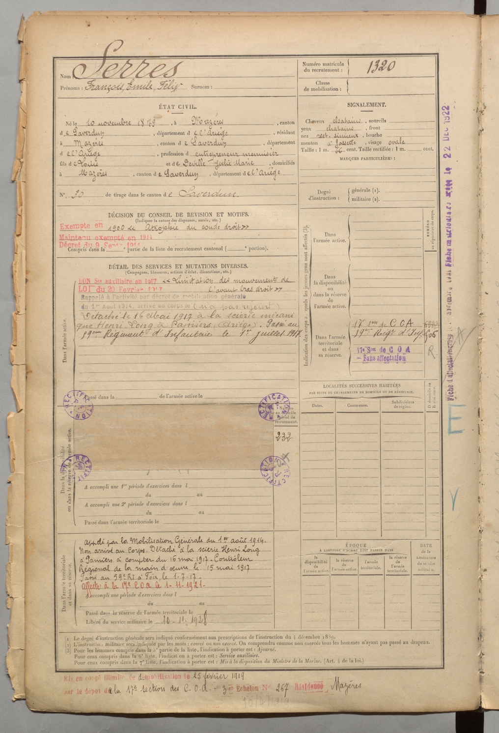 | Serres | François Emile Félix | FOIX | 1 R 458 | 1899 | Mazères | Mazères | 1320 |