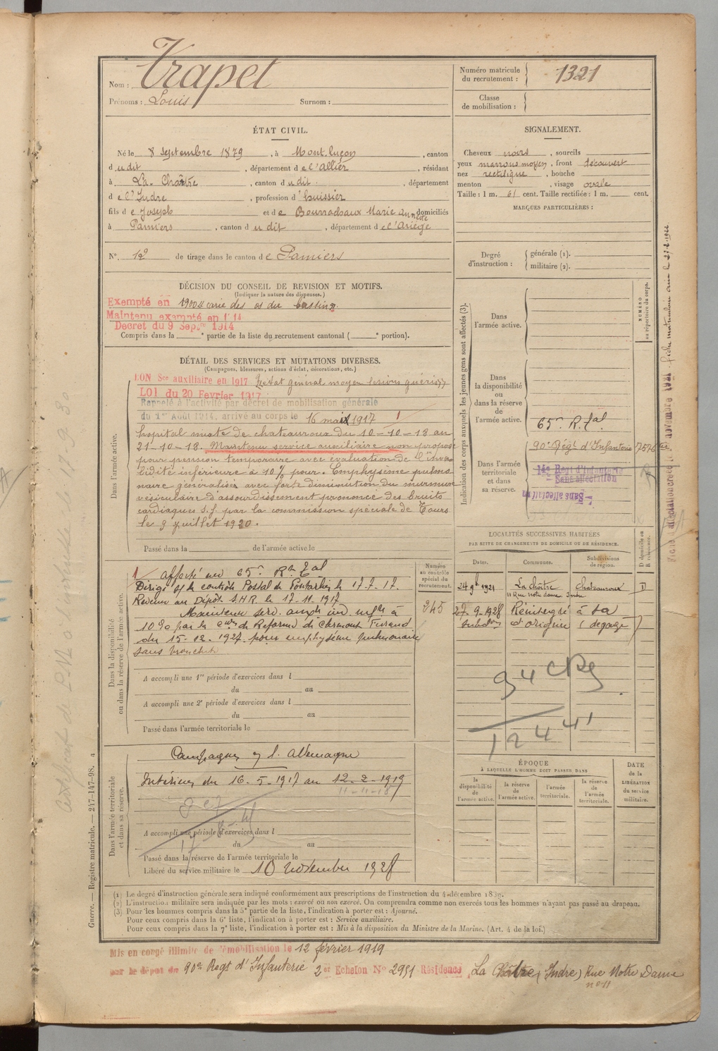 | Trapet | Louis | FOIX | 1 R 458 | 1899 | Montluçon | Chartre (La) | 1321 |