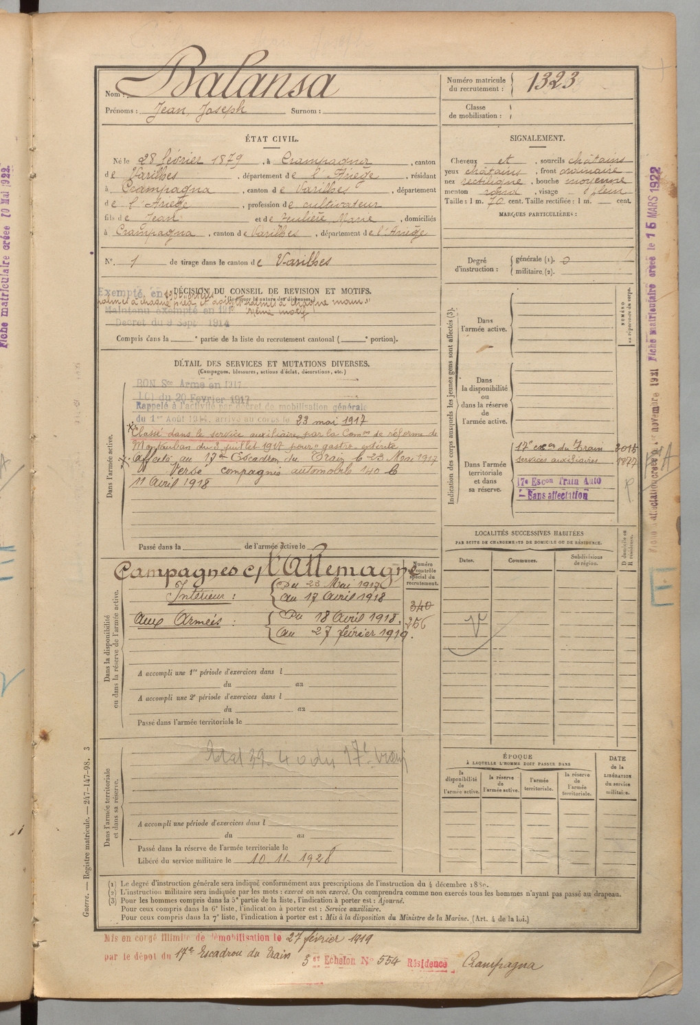| Balansa | Jean Joseph | FOIX | 1 R 458 | 1899 | Crampagna | Crampagna | 1323 |