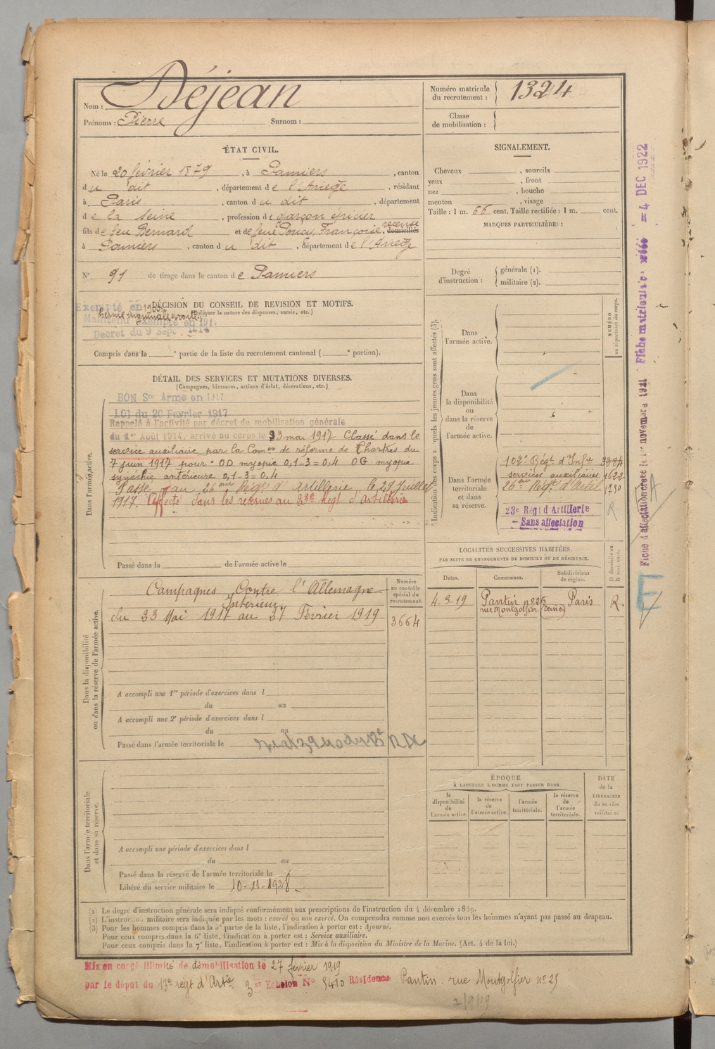 | Déjean | Pierre | FOIX | 1 R 458 | 1899 | Pamiers | Paris | 1324 |