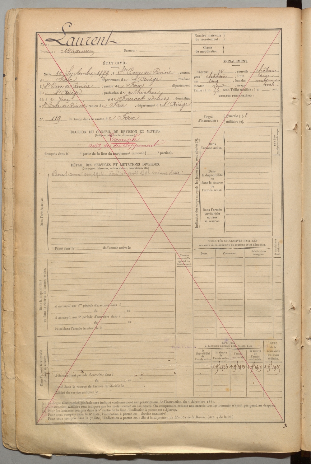 | Laurent | Maximin | FOIX | 1 R 457 | 1899 | Saint-Pierre-de-Rivière | Saint-Pierre-de-Rivière | 3028 |