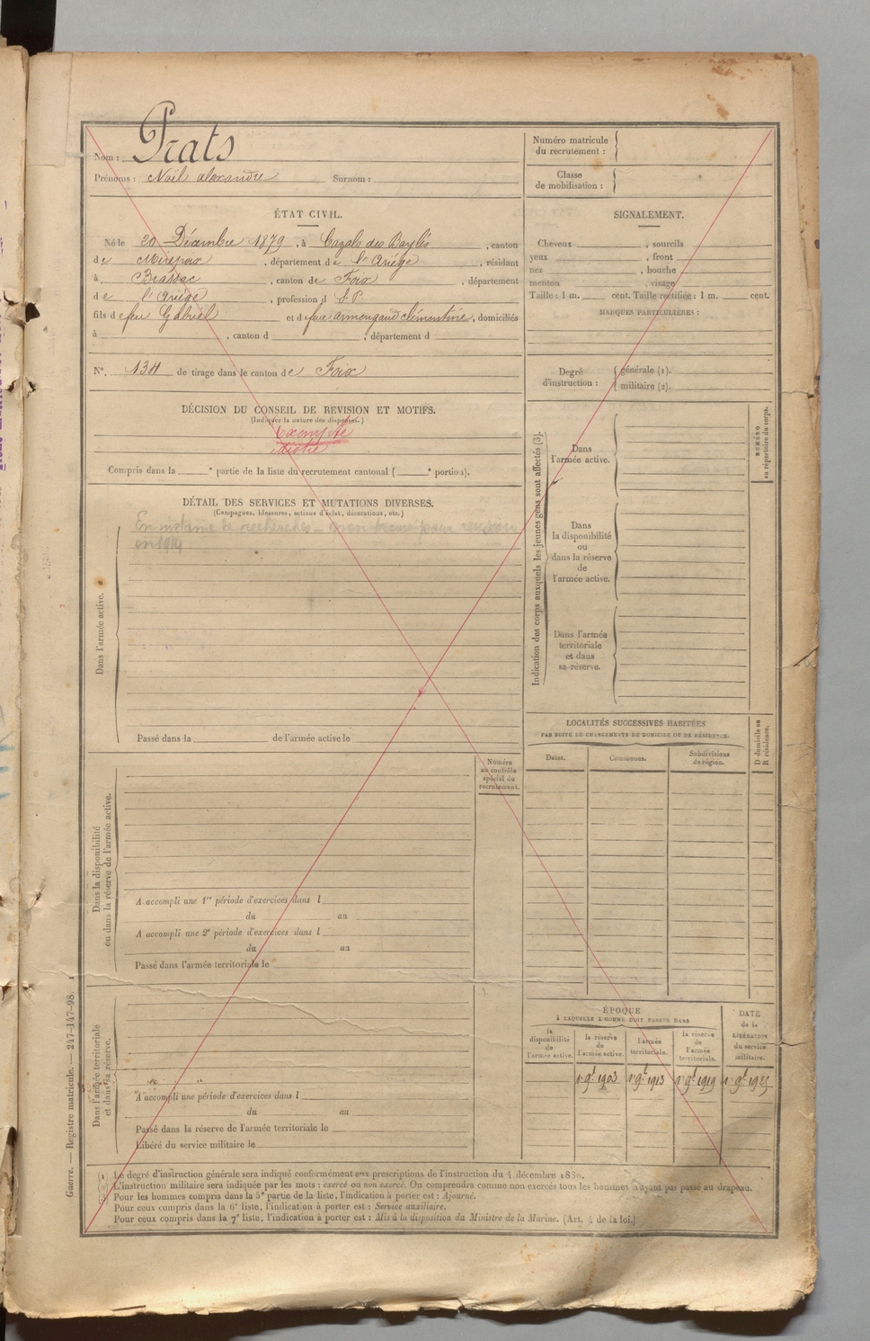| Prat | Noël Alexandre | FOIX | 1 R 457 | 1899 | Carla-Bayle (Le) | Brassac | 3029 |