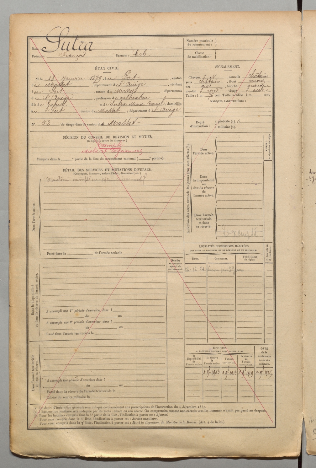 | Sutra | François dit Cole | FOIX | 1 R 458 | 1899 | Port (Le) | Port (Le) | 3027 |