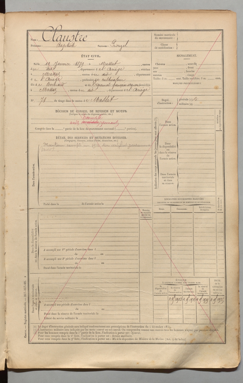 | Claustre | Baptiste dit Piouzel | FOIX | 1 R 458 | 1899 | Massat | Massat | 3029 |