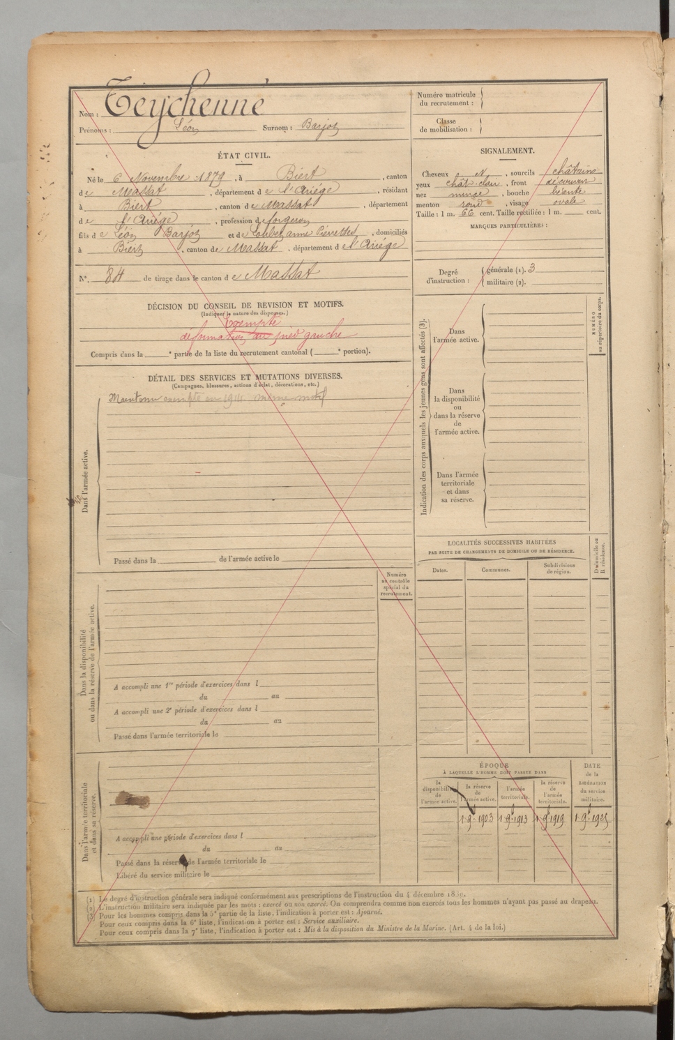 | Teychenné | Léon dit Barjot | FOIX | 1 R 458 | 1899 | Biert | Biert | 3030 |