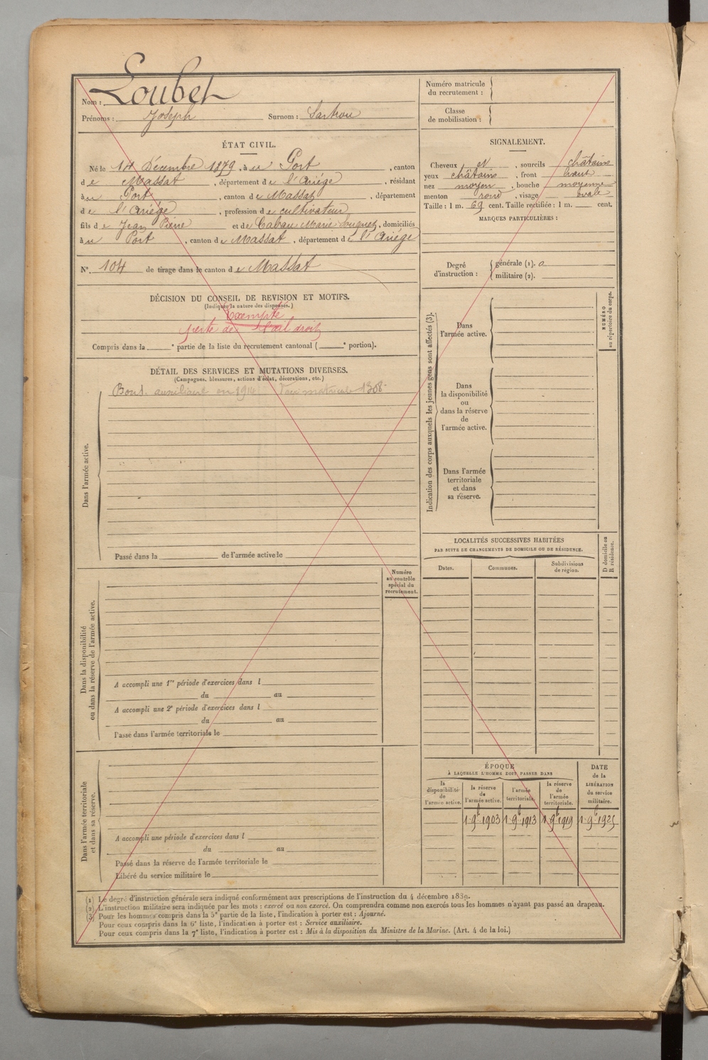 | Loubet | Joseph dit Sartrou | FOIX | 1 R 458 | 1899 | Port (Le) | Port (Le) | 3031 |