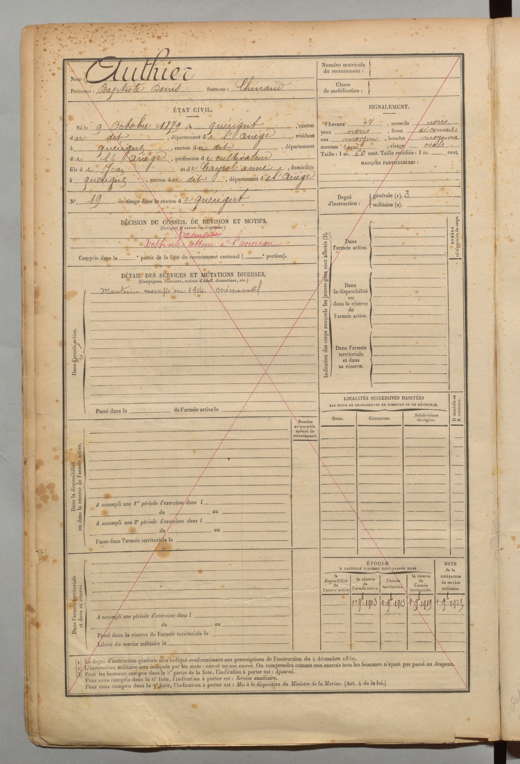 | Authier | Baptiste Denis dit Chinaud | FOIX | 1 R 458 | 1899 | Quérigut | Quérigut | 3033 |