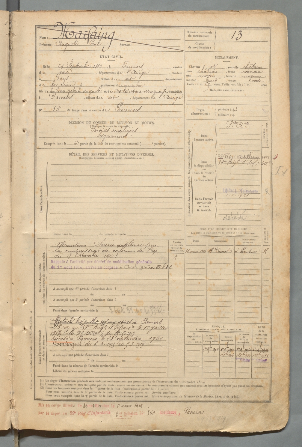 | Marfaing | Augute Paul | FOIX | 129 W 2 | 1900 | Pamiers | Paris | 13 |