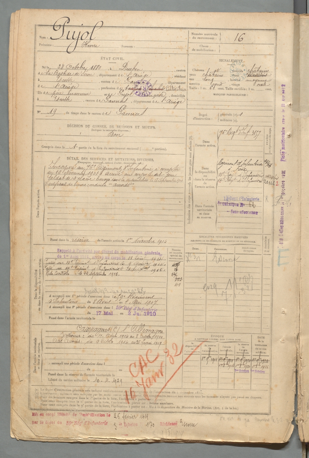 | Pujol | Henri | FOIX | 129 W 2 | 1900 | Durban-sur-Arize | Escosse | 16 |