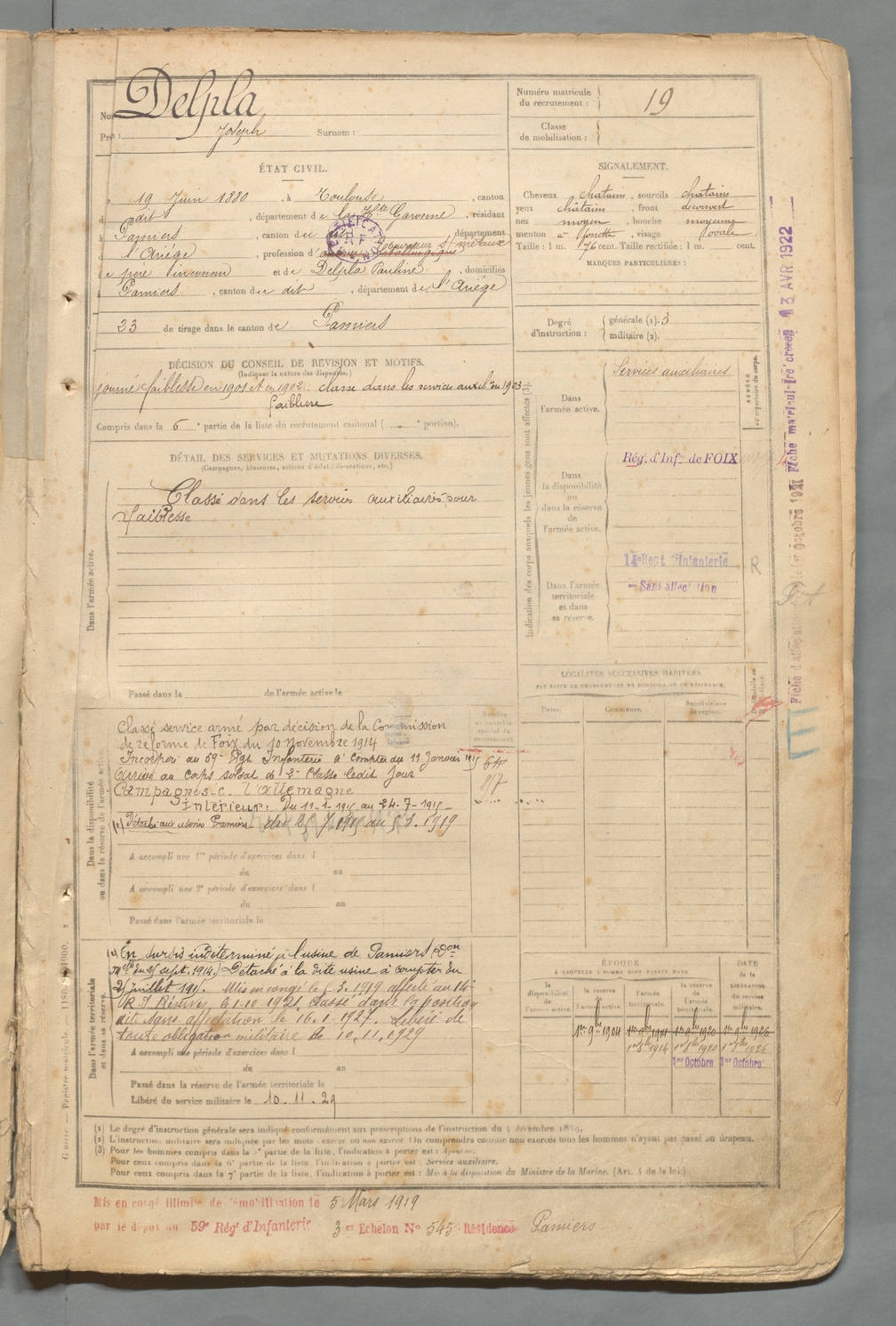 | Delpla | Joseph | FOIX | 129 W 2 | 1900 | Toulouse | Pamiers | 19 |