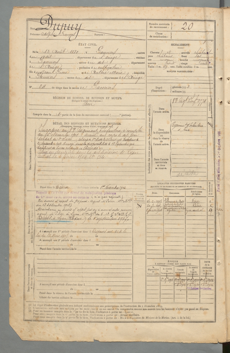 | Dupuy | Adolphe François | FOIX | 129 W 2 | 1900 | Pamiers | Pamiers | 20 |