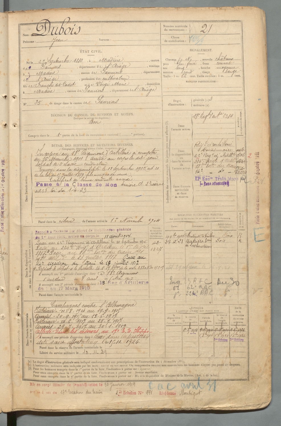 | Dubois | Jean | FOIX | 129 W 2 | 1900 | Madières | Madières | 21 |