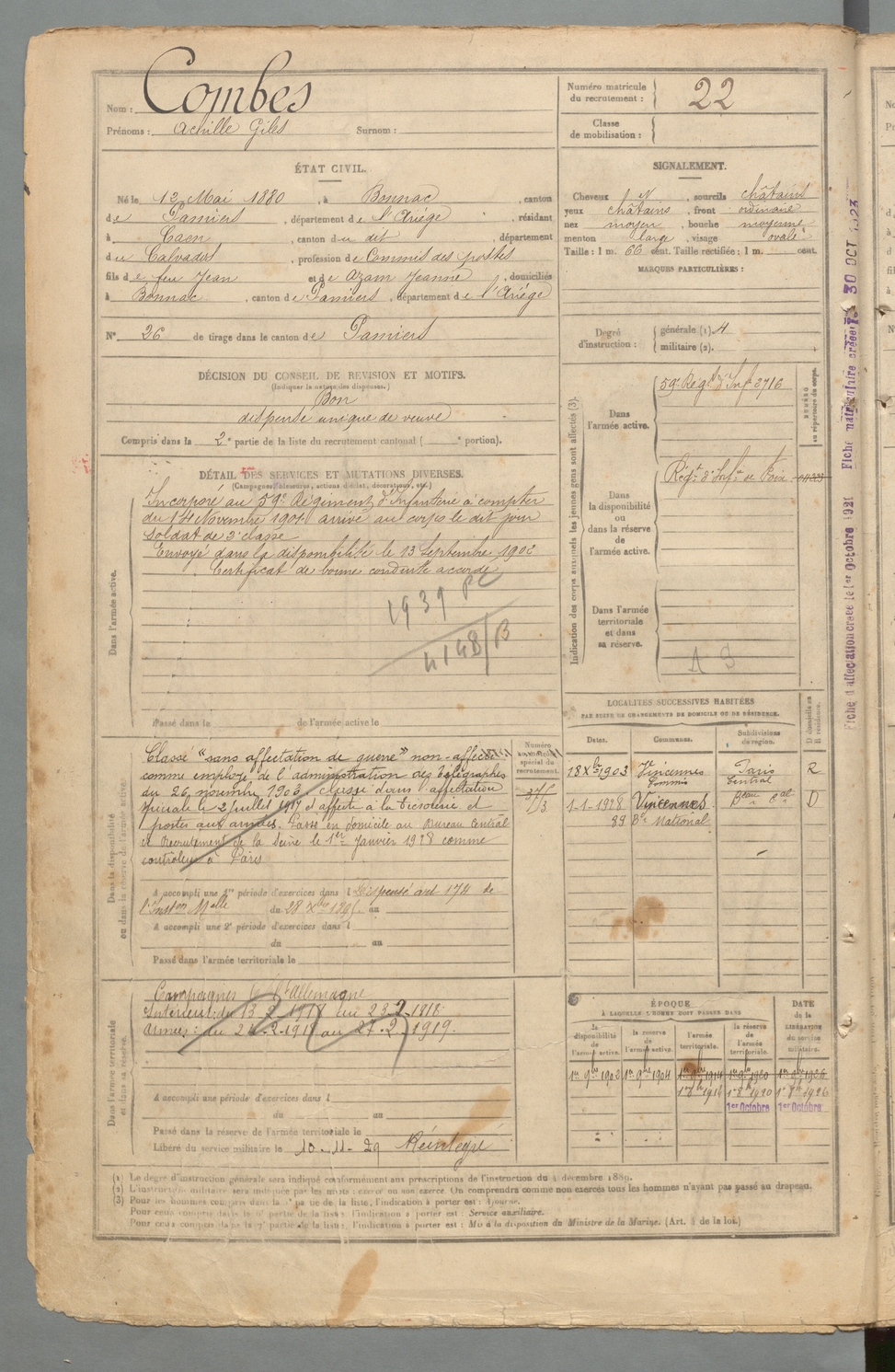 | Combes | Achille Giles | FOIX | 129 W 2 | 1900 | Bonnac | Caen | 22 |