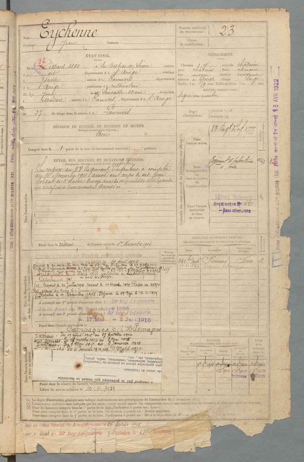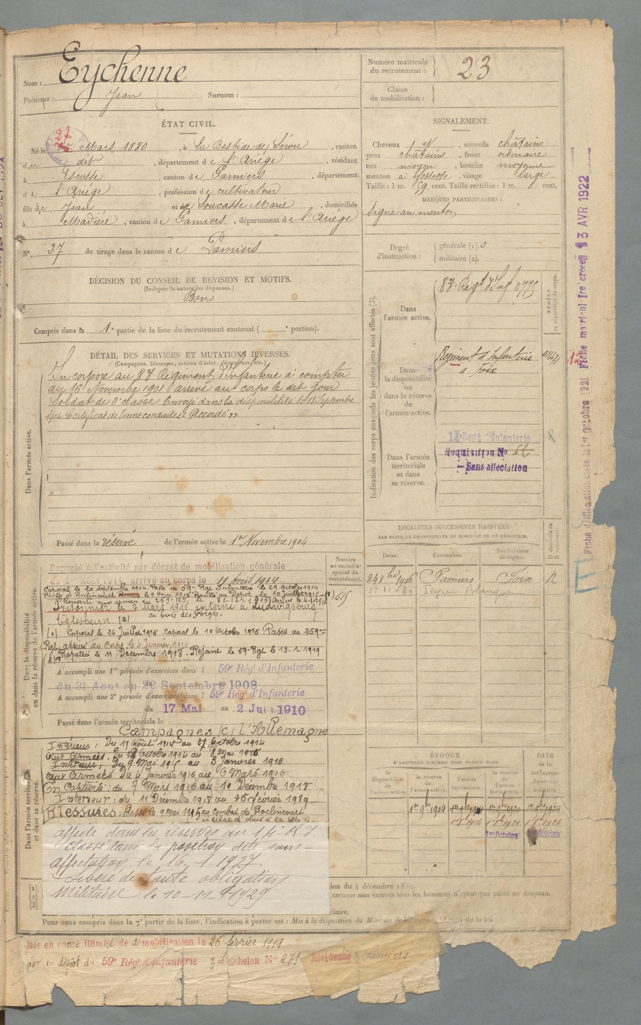 | Eychenne | Jean | FOIX | 129 W 2 | 1900 | Bastide-de-Sérou (La) | Escosse | 23 |