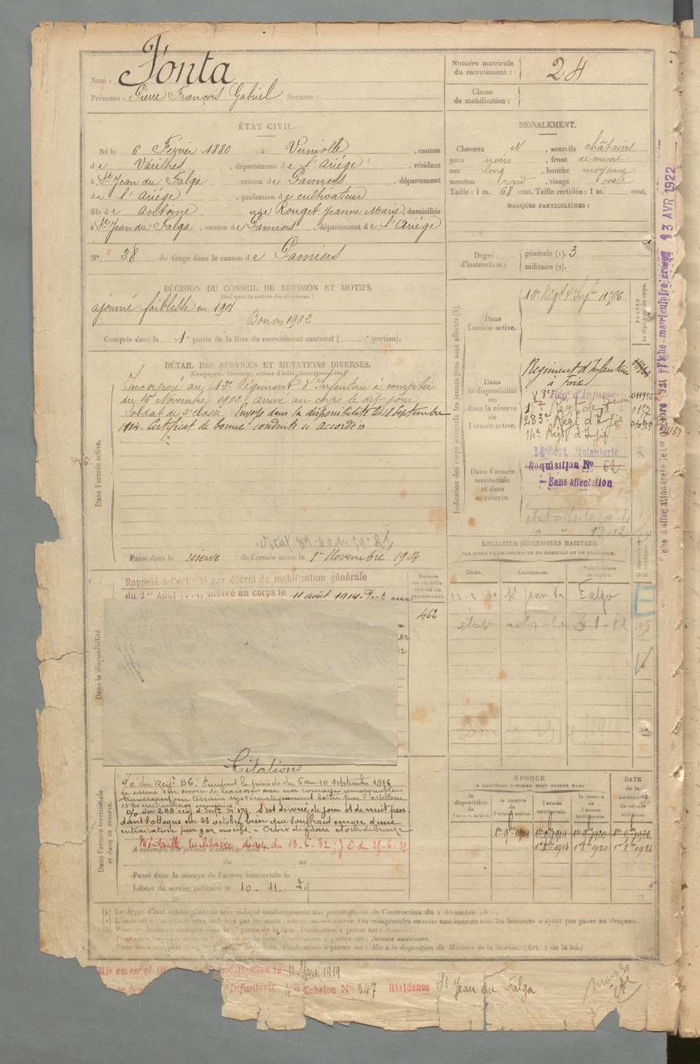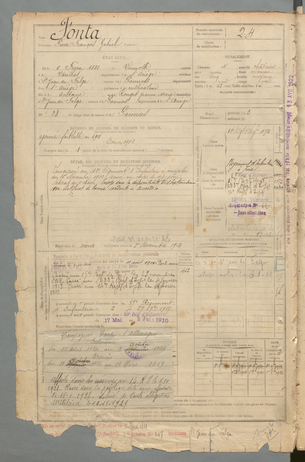 | Fonta | Pierre François Gabriel | FOIX | 129 W 2 | 1900 | Verniolle | Saint-Jean-du-Falga | 24 |