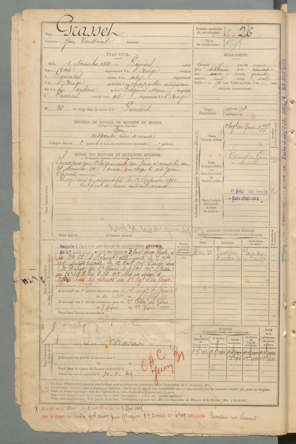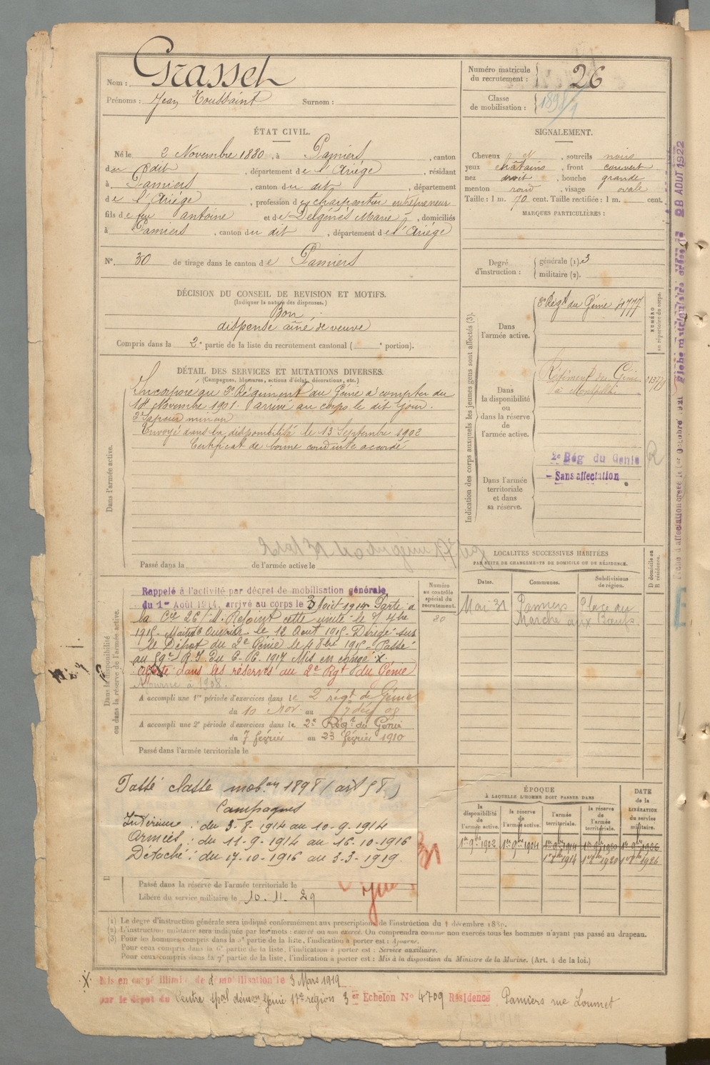 | Grasset | Jean Toussaint | FOIX | 129 W 2 | 1900 | Pamiers | Pamiers | 26 |
