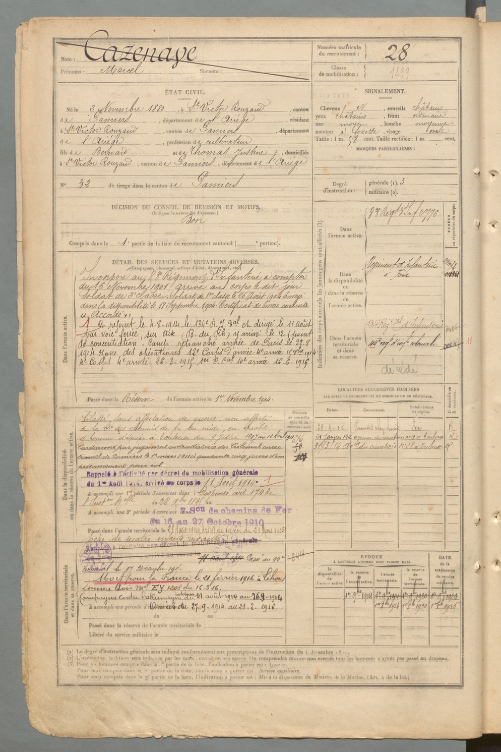| Cazenave | Marcel | FOIX | 129 W 2 | 1900 | Saint-Victor-Rouzaud | Saint-Victor-Rouzaud | 28 |