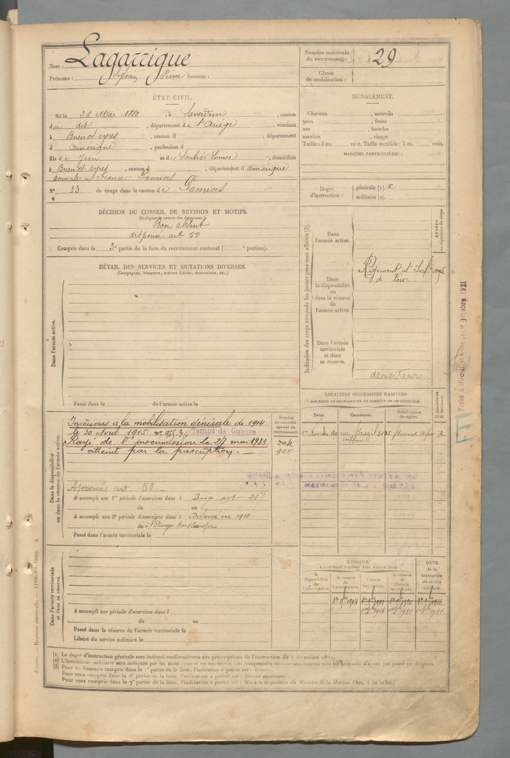 | Lagarrigue | Sylvain Pierre | FOIX | 129 W 2 | 1900 | Saverdun | Buenos-Ayres | 29 |