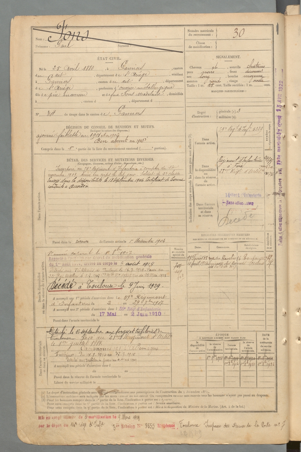 | Fons | Paul | FOIX | 129 W 2 | 1900 | Pamiers | Pamiers | 30 |