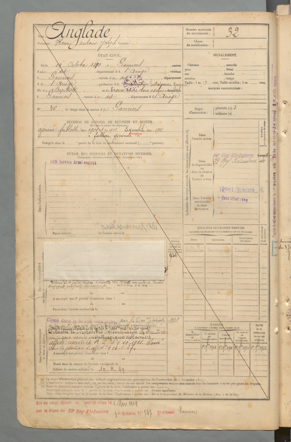 | Anglade | Henri Antoine Joseph | FOIX | 129 W 2 | 1900 | Pamiers | Pamiers | 32 |