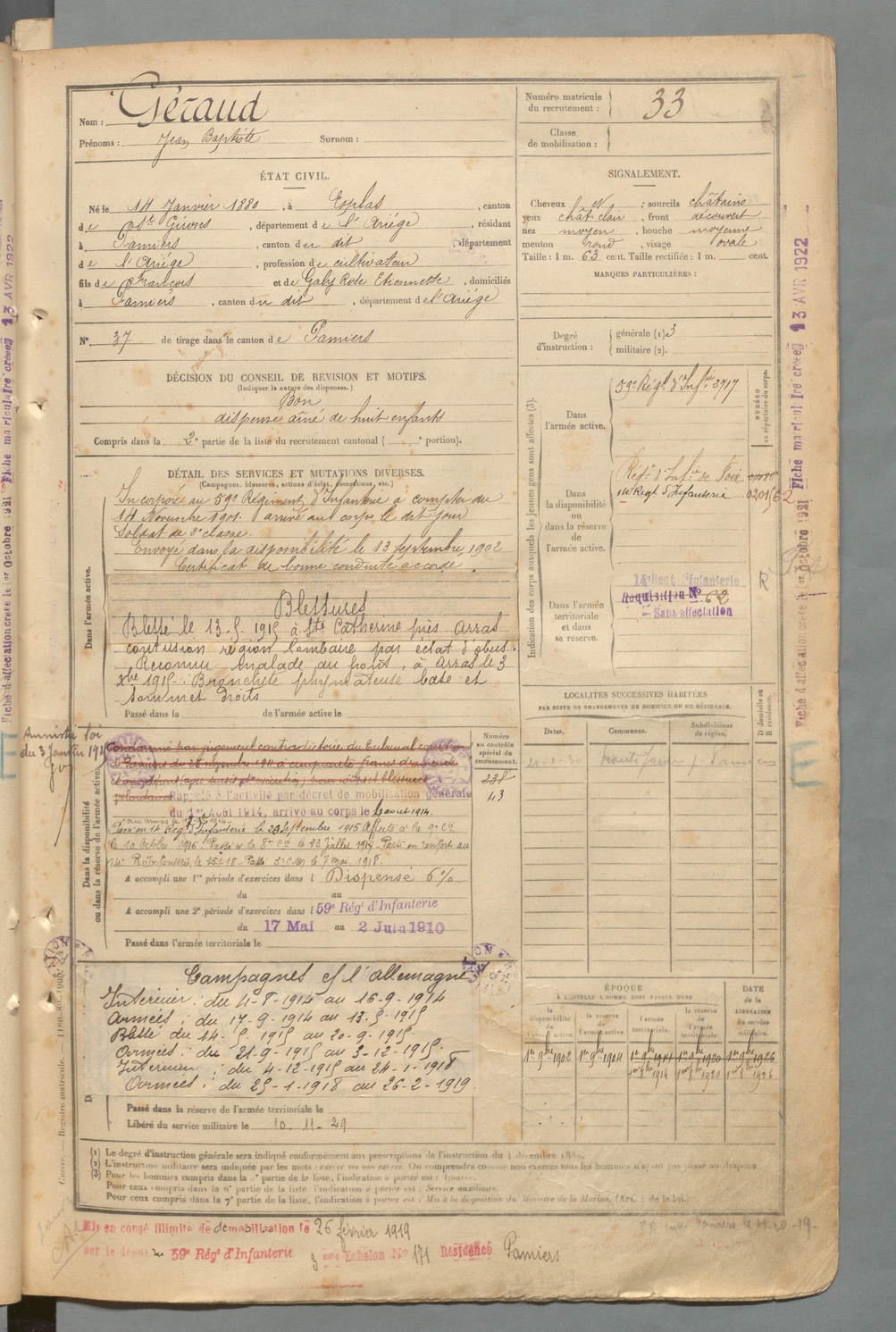 | Géraud | Jean Baptiste | FOIX | 129 W 2 | 1900 | Esplas-de-Sérou | Pamiers | 33 |