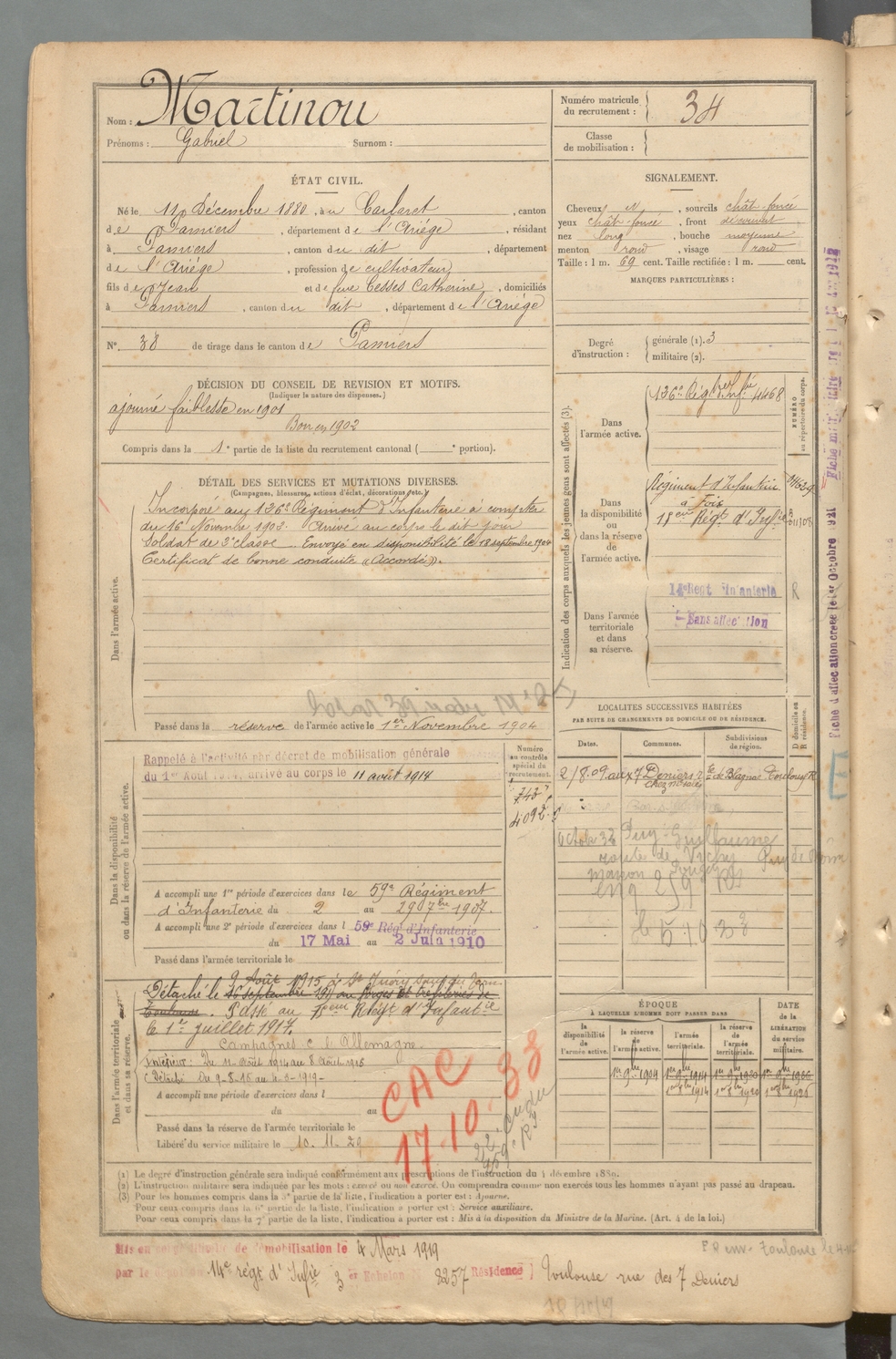 | Martinou | Gabriel | FOIX | 129 W 2 | 1900 | Carlaret (Le) | Pamiers | 34 |