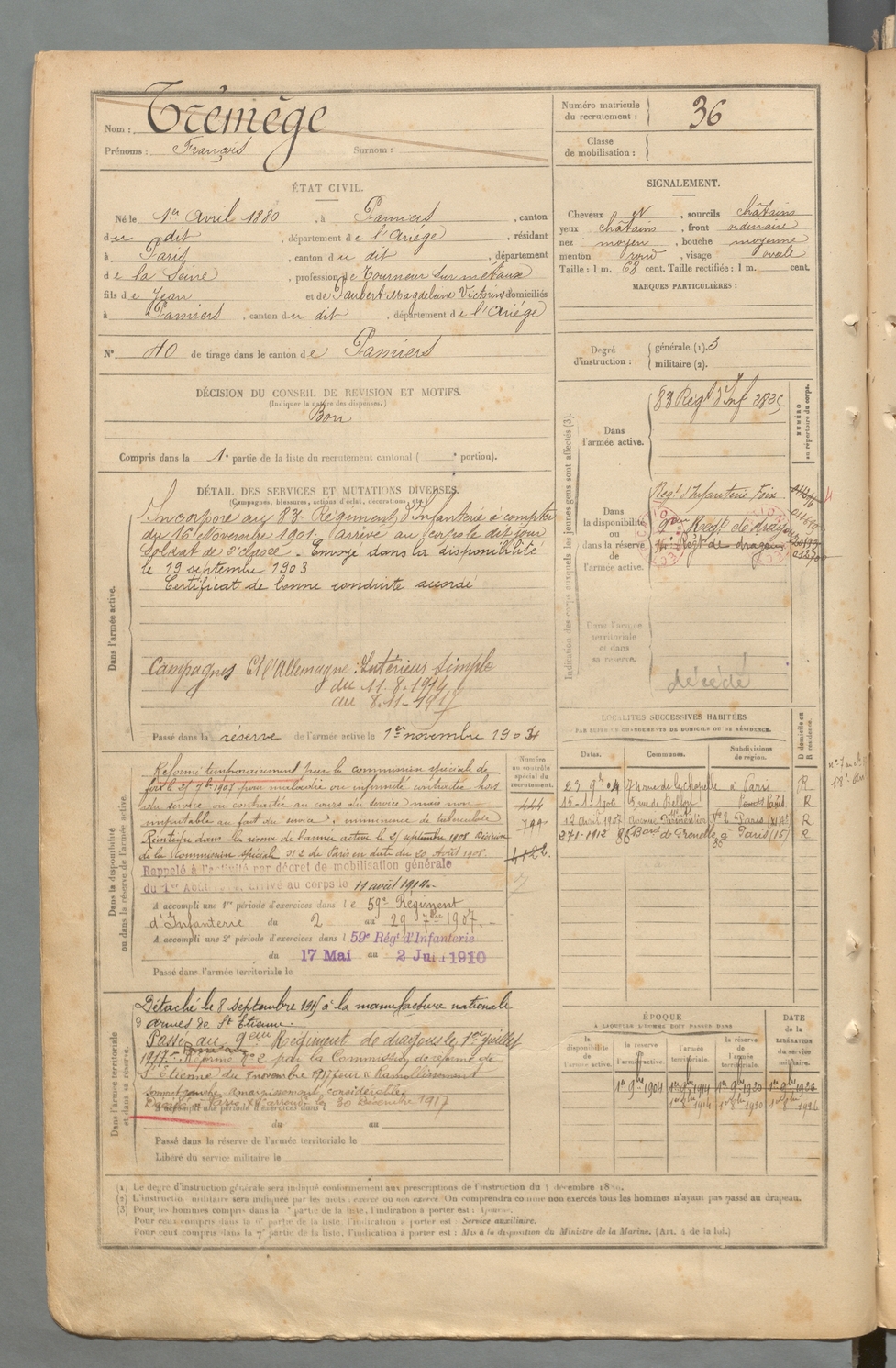| Trémège | François | FOIX | 129 W 2 | 1900 | Pamiers | Paris | 36 |