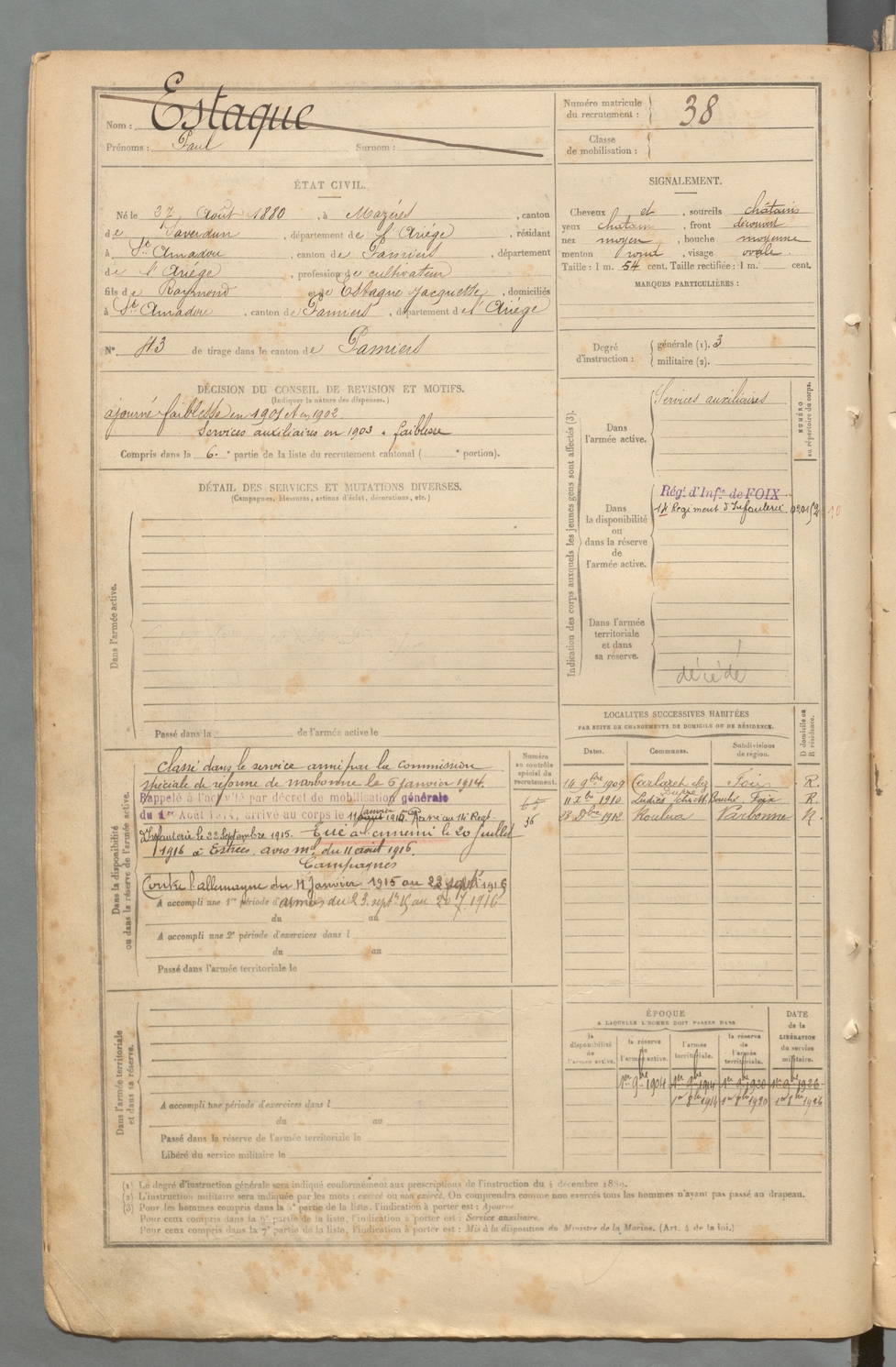 | Estaque | Paul | FOIX | 129 W 2 | 1900 | Mazères | Saint-Amadou | 38 |