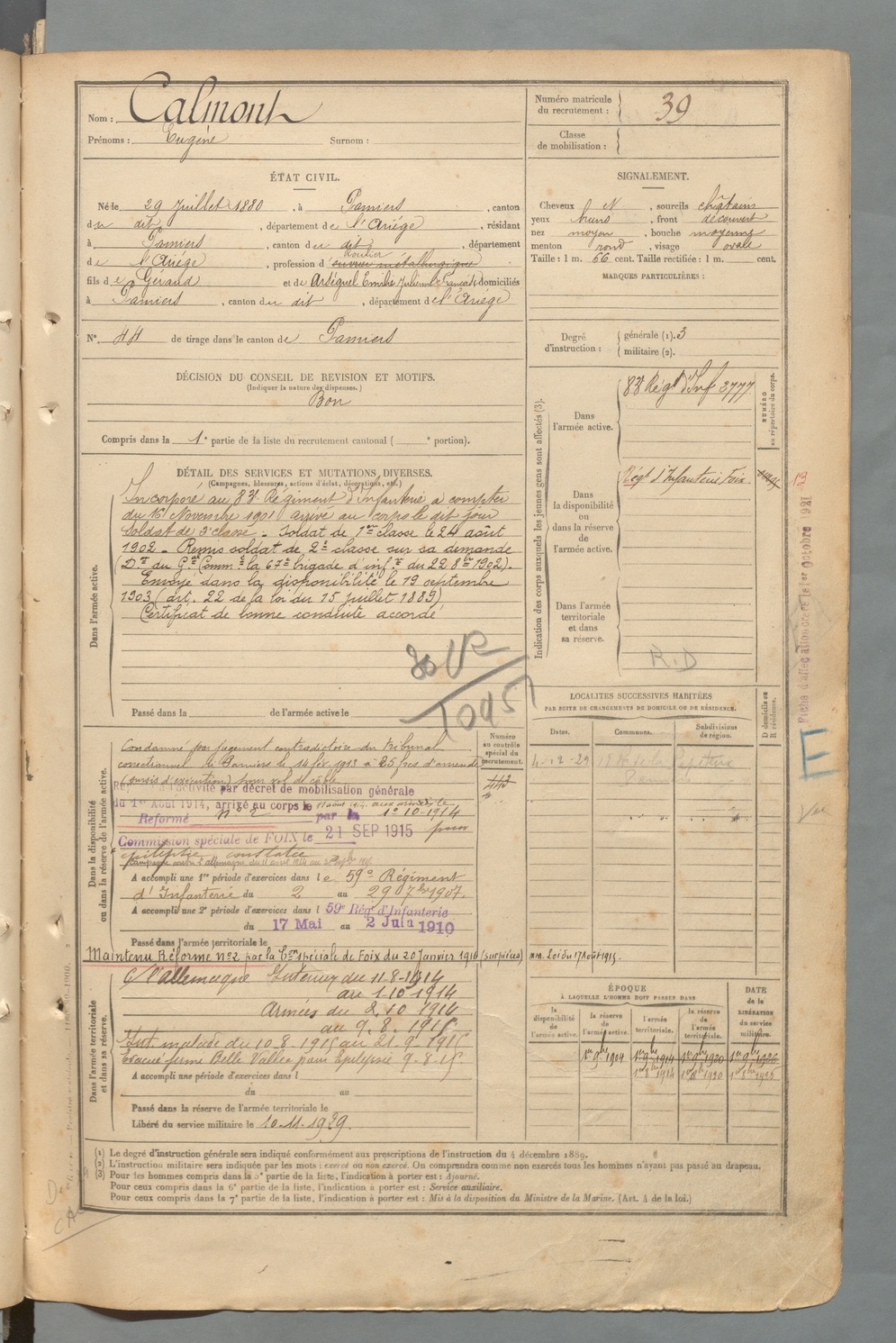 | Calmont | Eugène | FOIX | 129 W 2 | 1900 | Pamiers | Pamiers | 39 |