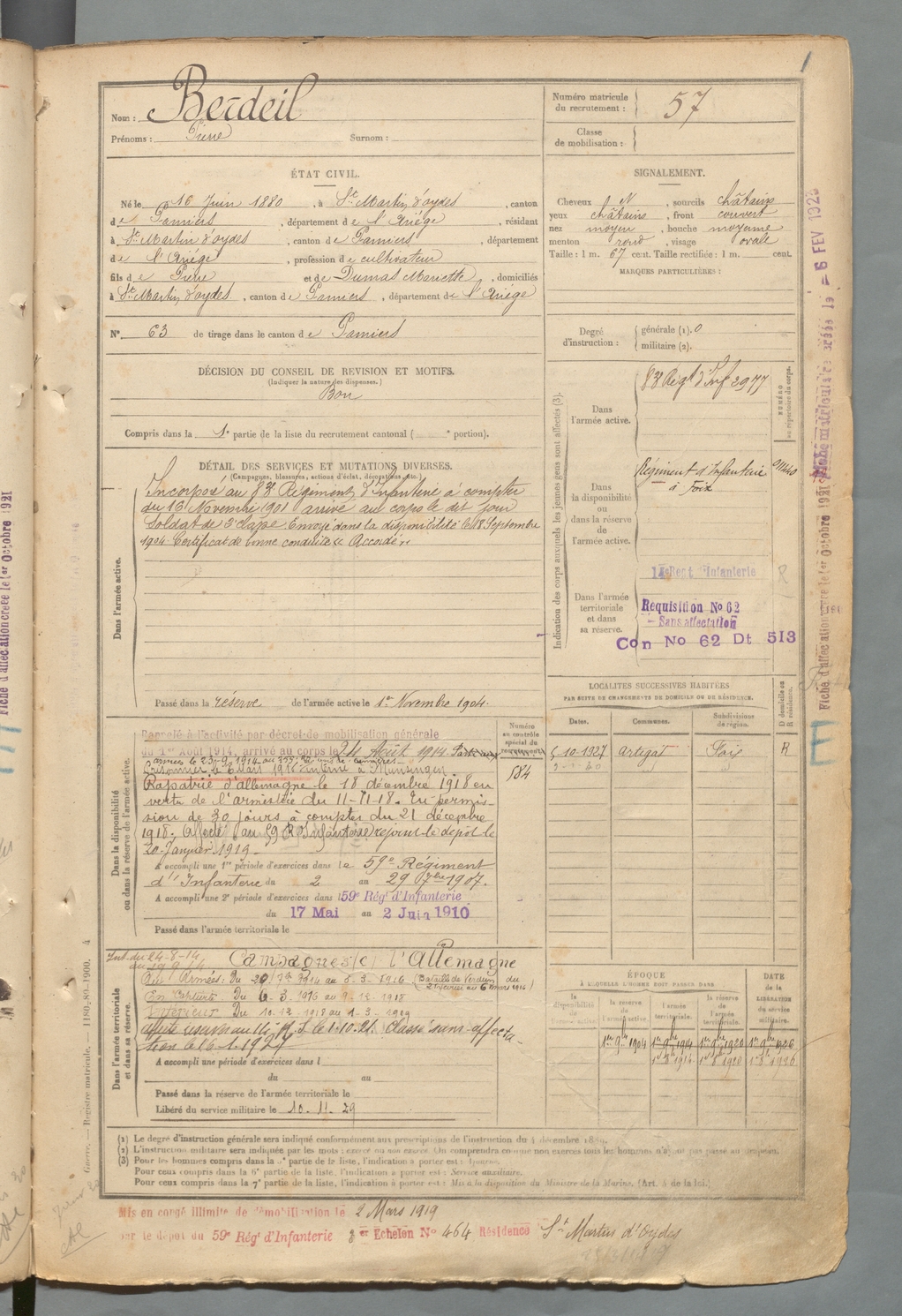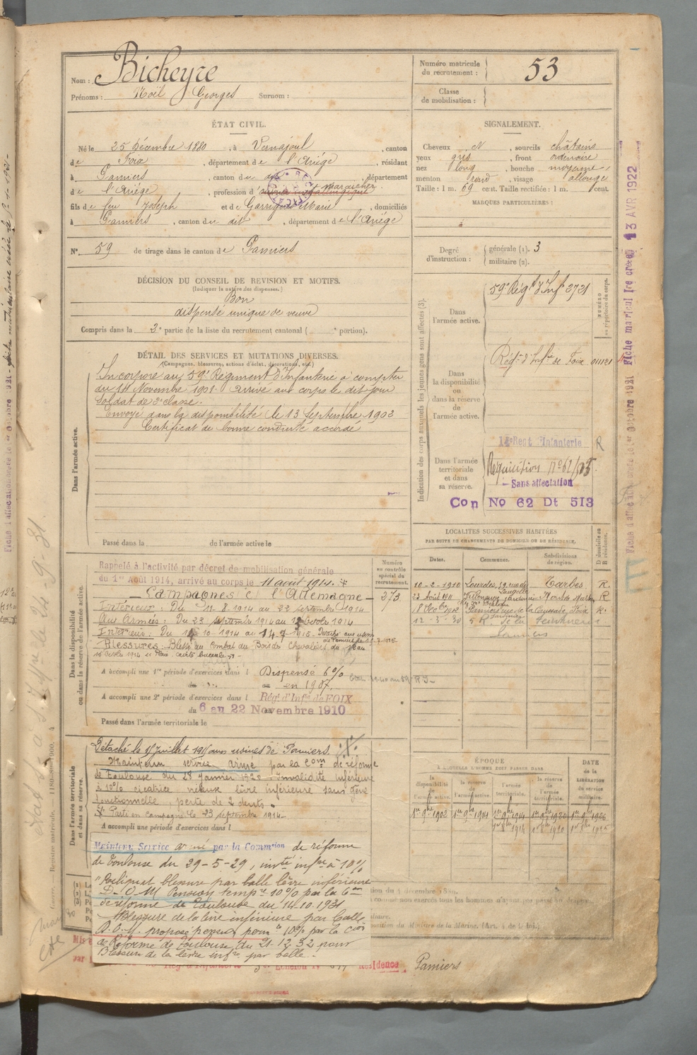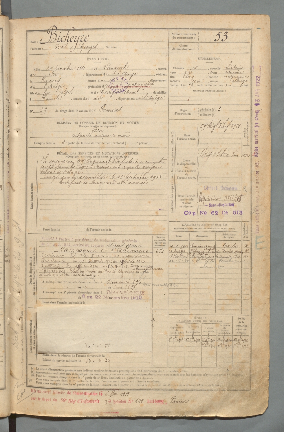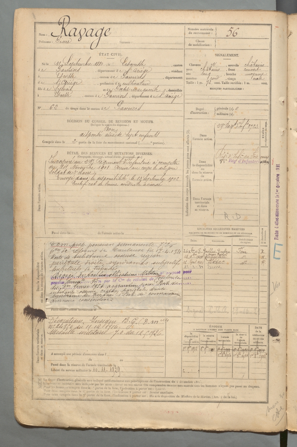 | Bicheyre | Noël Georges | FOIX | 129 W 2 | 1900 | Vernajoul | Pamiers | 53 |