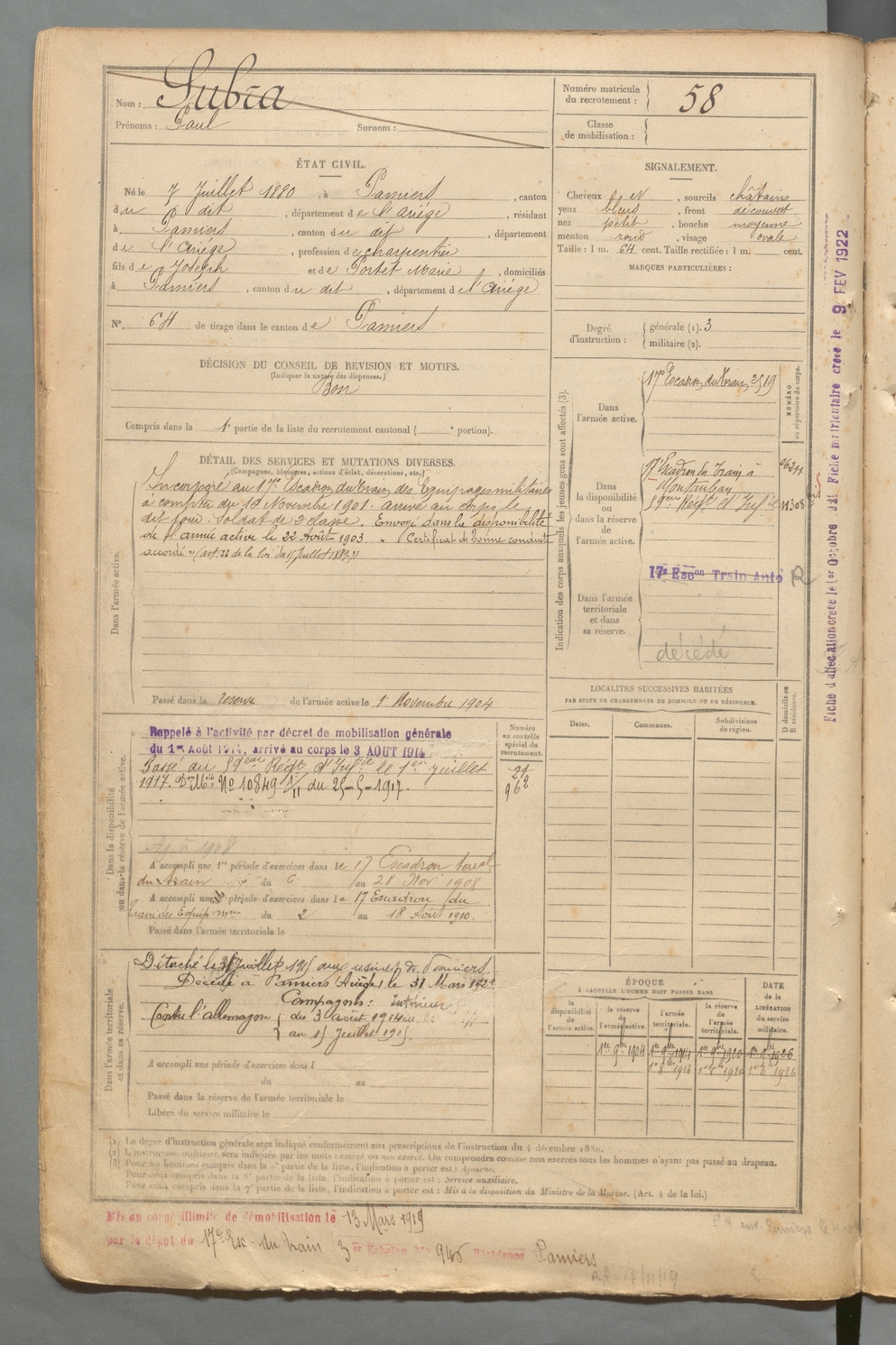 | Subra | Paul | FOIX | 129 W 2 | 1900 | Pamiers | Pamiers | 58 |