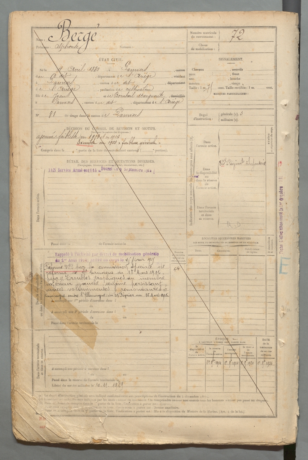 | Bergé | Alphonse | FOIX | 129 W 2 | 1900 | Pamiers | Pamiers | 72 |