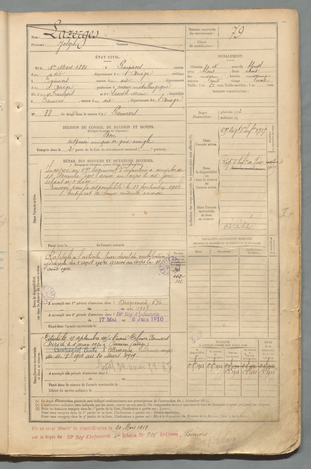 | Lazerges | Joseph | FOIX | 129 W 2 | 1900 | Pamiers | Pamiers | 79 |