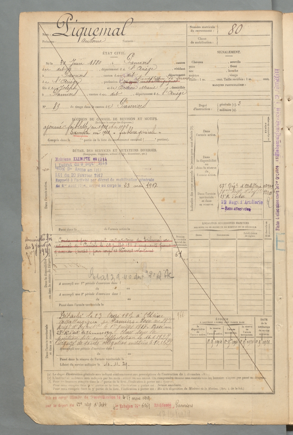 | Piquemal | Antoine | FOIX | 129 W 2 | 1900 | Pamiers | Pamiers | 80 |