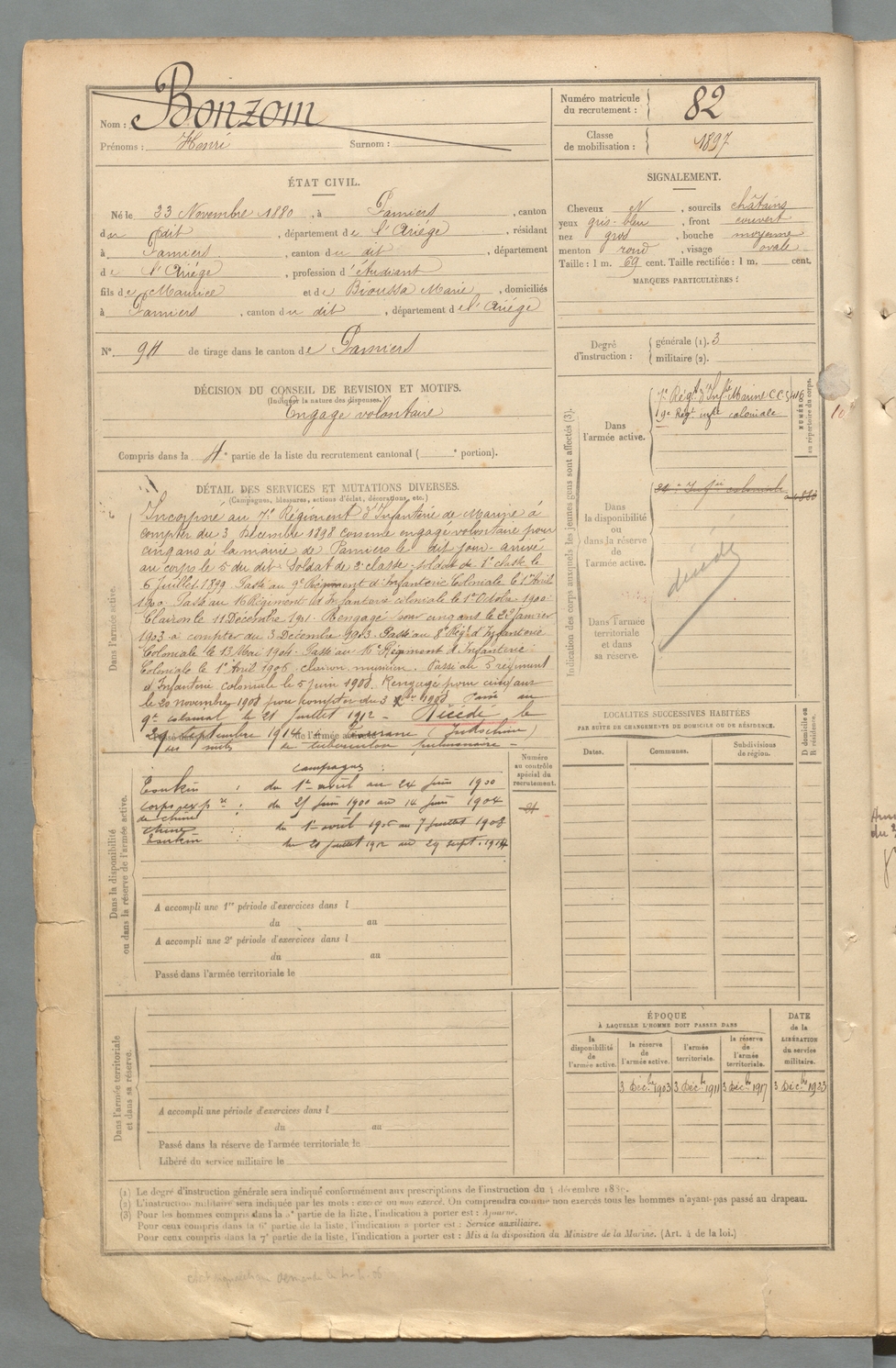 | Bonzom | Henri | FOIX | 129 W 2 | 1900 | Pamiers | Pamiers | 82 |