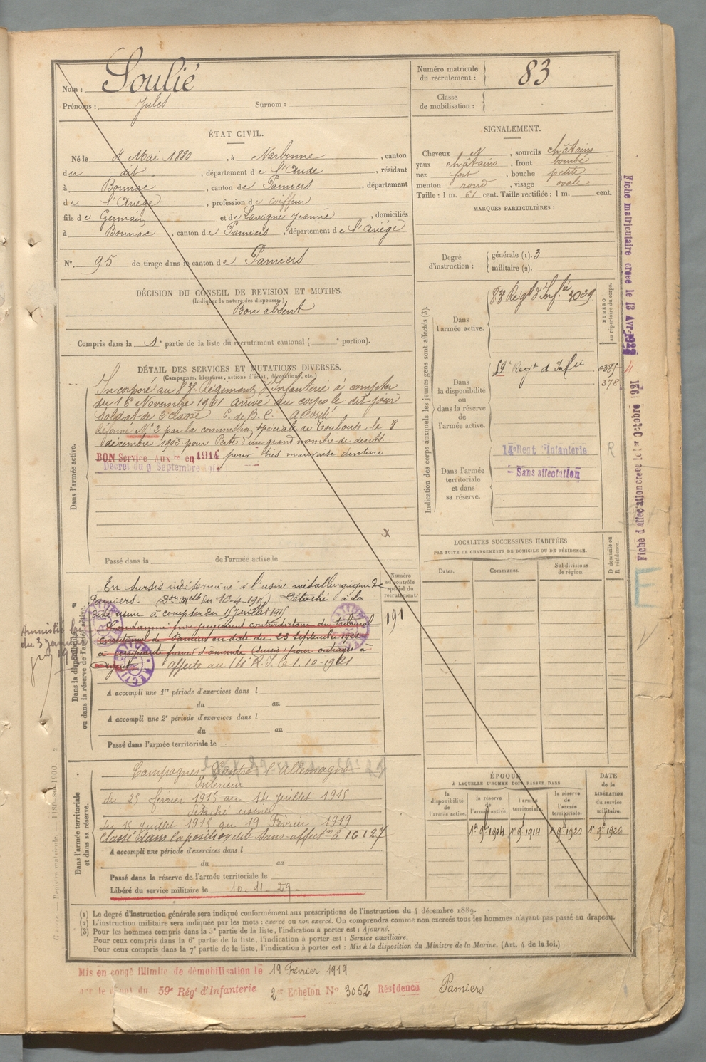 | Soulié | Jules | FOIX | 129 W 2 | 1900 | Narbonne | Bonnac | 83 |