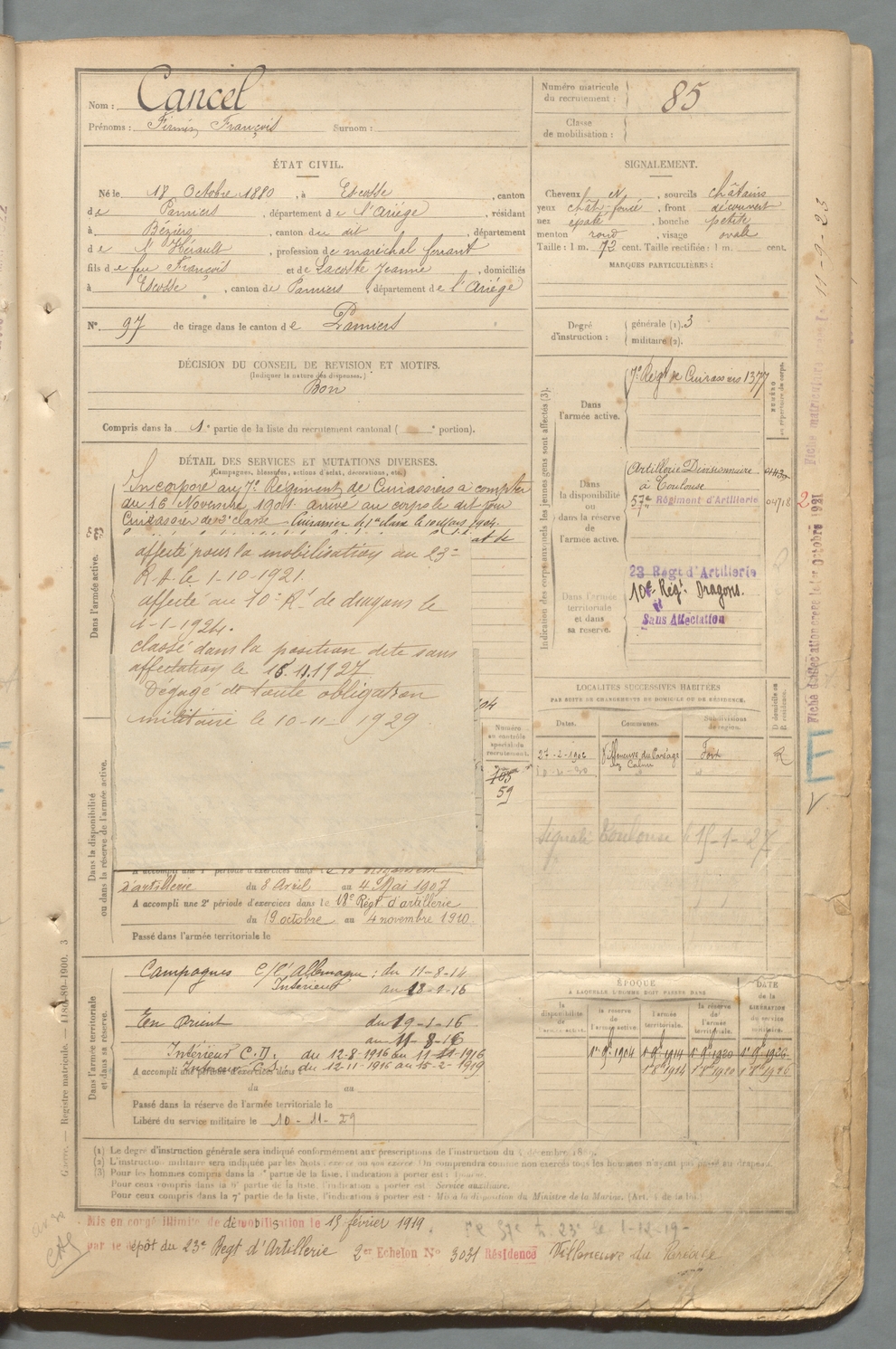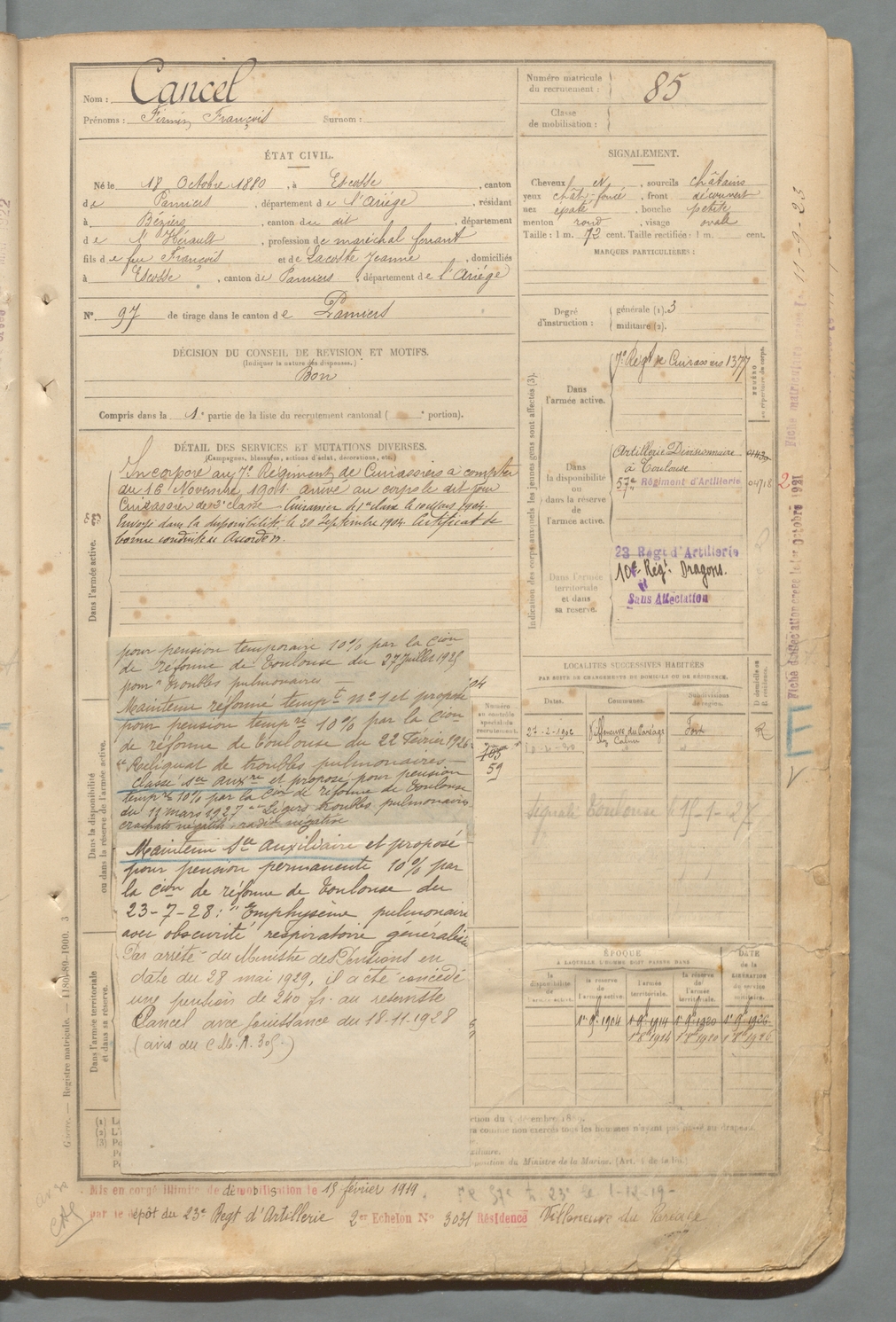 | Cancel | Firmin François | FOIX | 129 W 2 | 1900 | Escosse | Béziers | 85 |