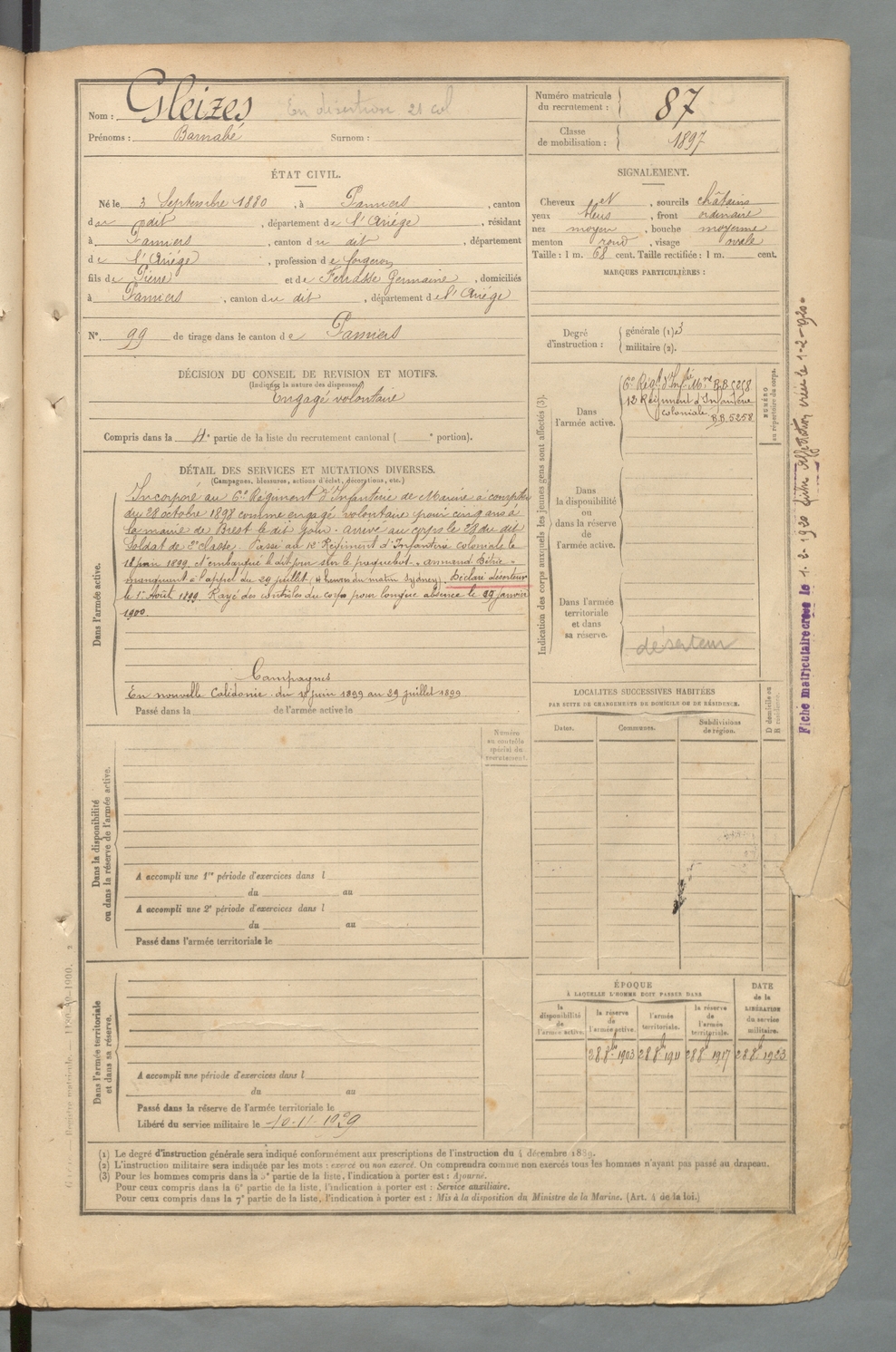 | Gleizes | Barnabé | FOIX | 129 W 2 | 1900 | Pamiers | Pamiers | 87 |