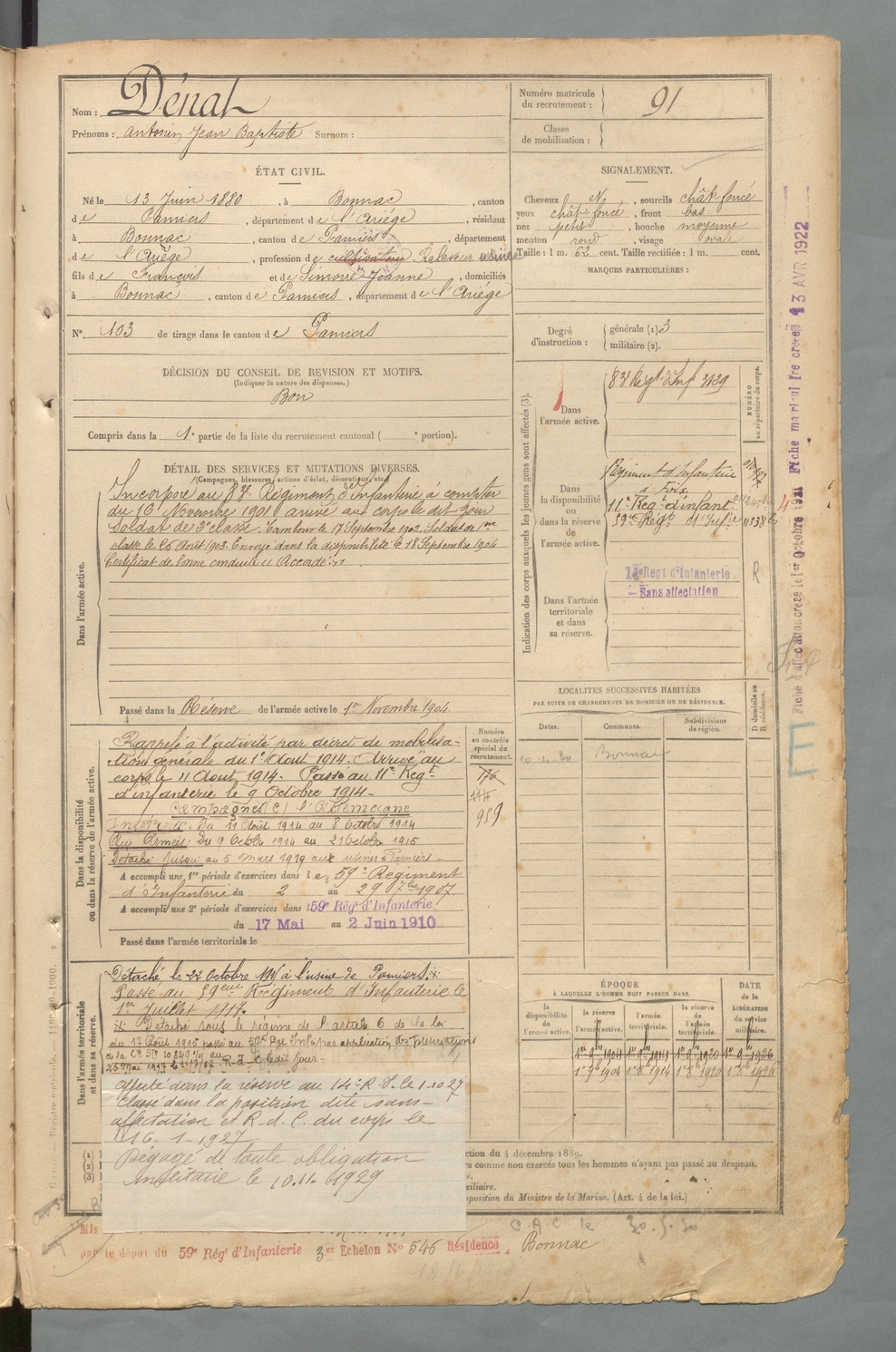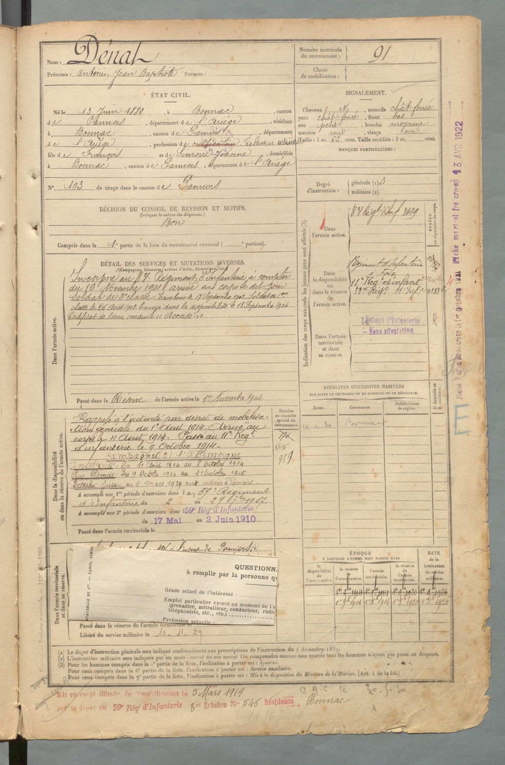 | Dénat | Antonin Jean Baptiste | FOIX | 129 W 2 | 1900 | Bonnac | Bonnac | 91 |