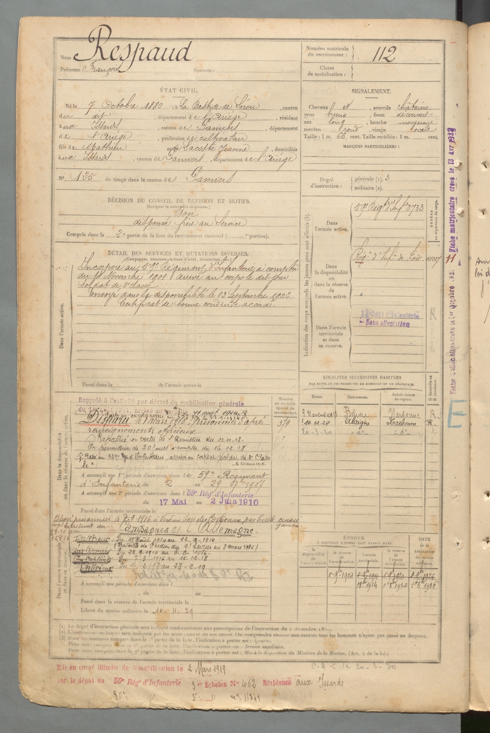 | Respaud | François | FOIX | 129 W 2 | 1900 | Bastide-de-Sérou (La) | Issards (Les) | 112 |