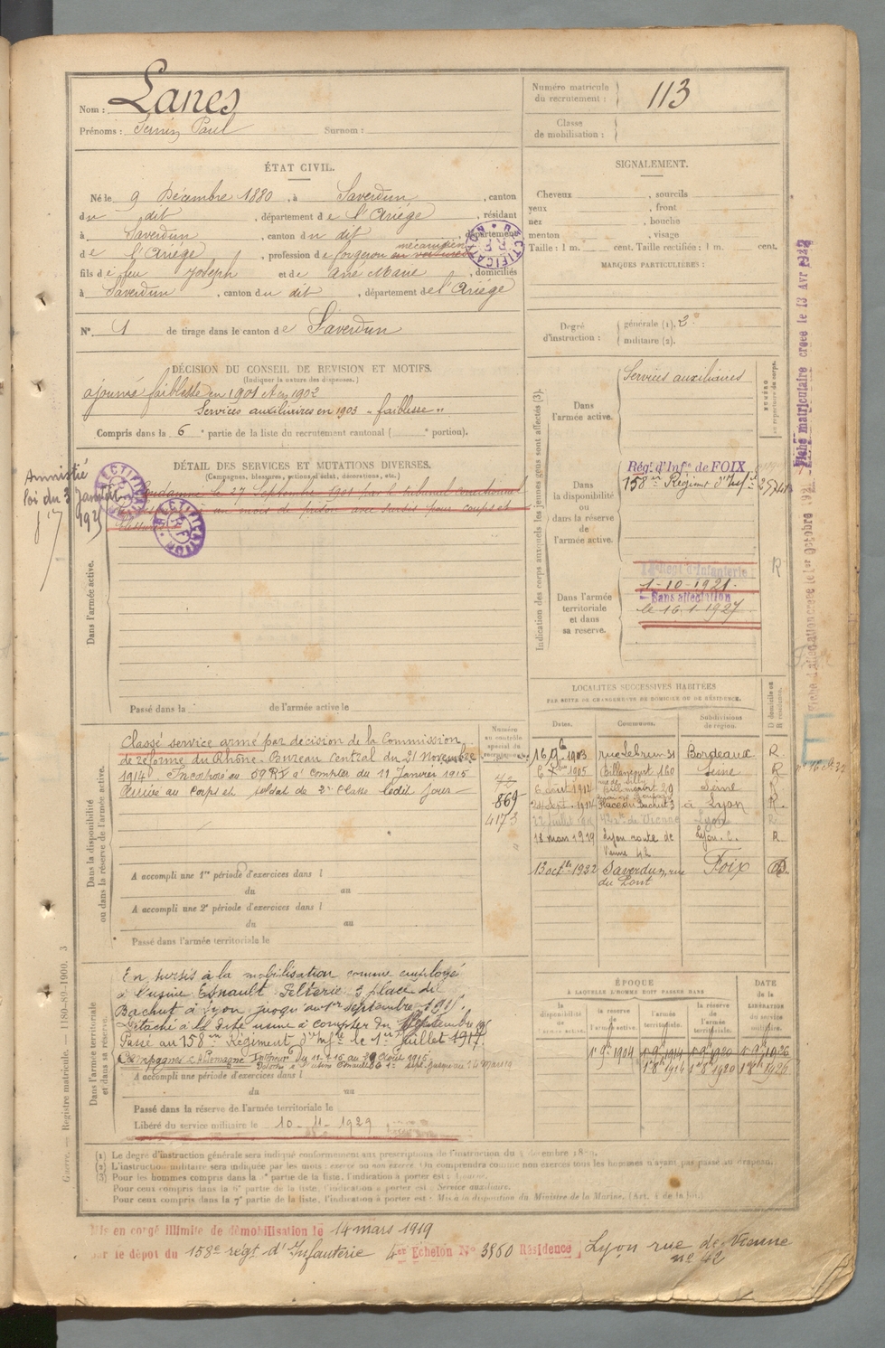 | Lanes | Sernin Paul | FOIX | 129 W 2 | 1900 | Saverdun | Saverdun | 113 |