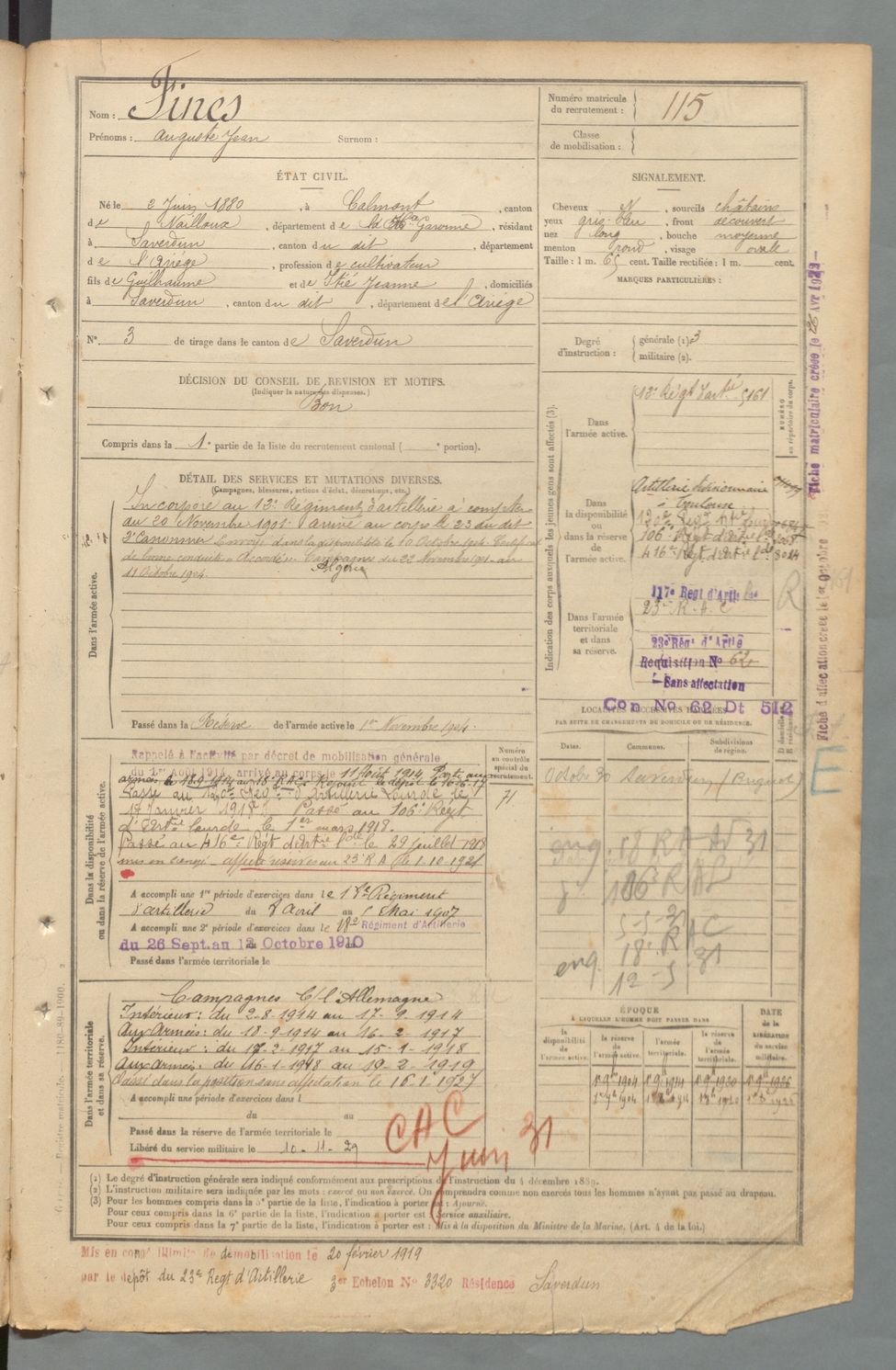 | Fines | Auguste Jean | FOIX | 129 W 2 | 1900 | Calmont | Saverdun | 115 |