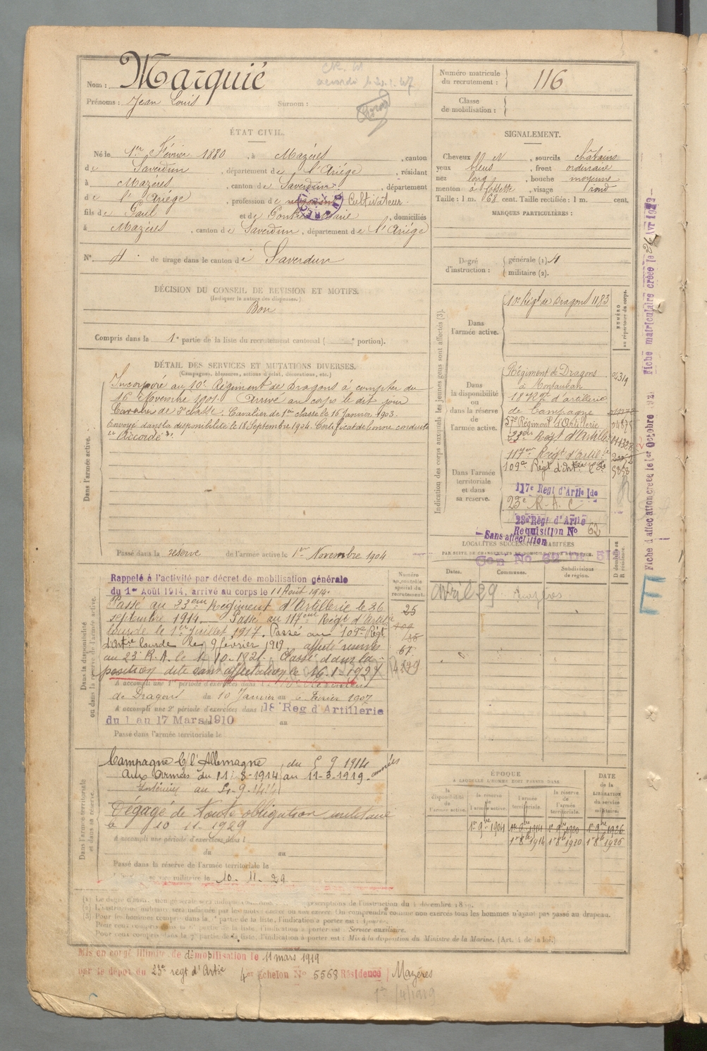 | Marquié | Jean Louis | FOIX | 129 W 2 | 1900 | Mazères | Mazères | 116 |